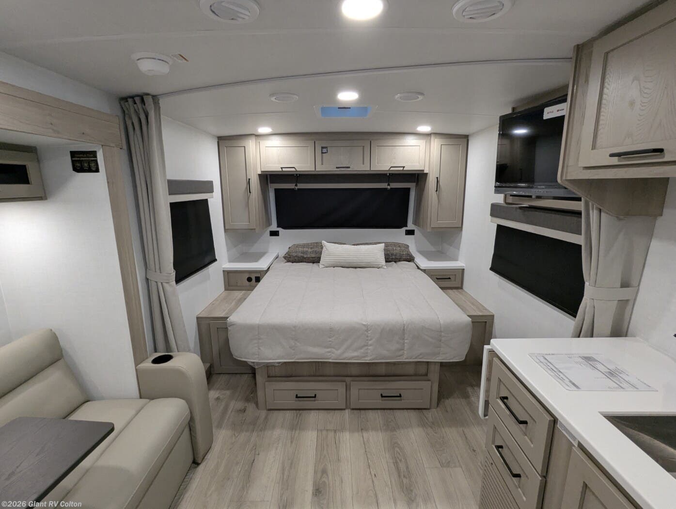 • Premium Features & Off-Grid Capability including a 200W solar panel with inverter, heated tanks, 15K BTU A/C, solid-surface countertops, and enclosed underbelly for extended-season camping.