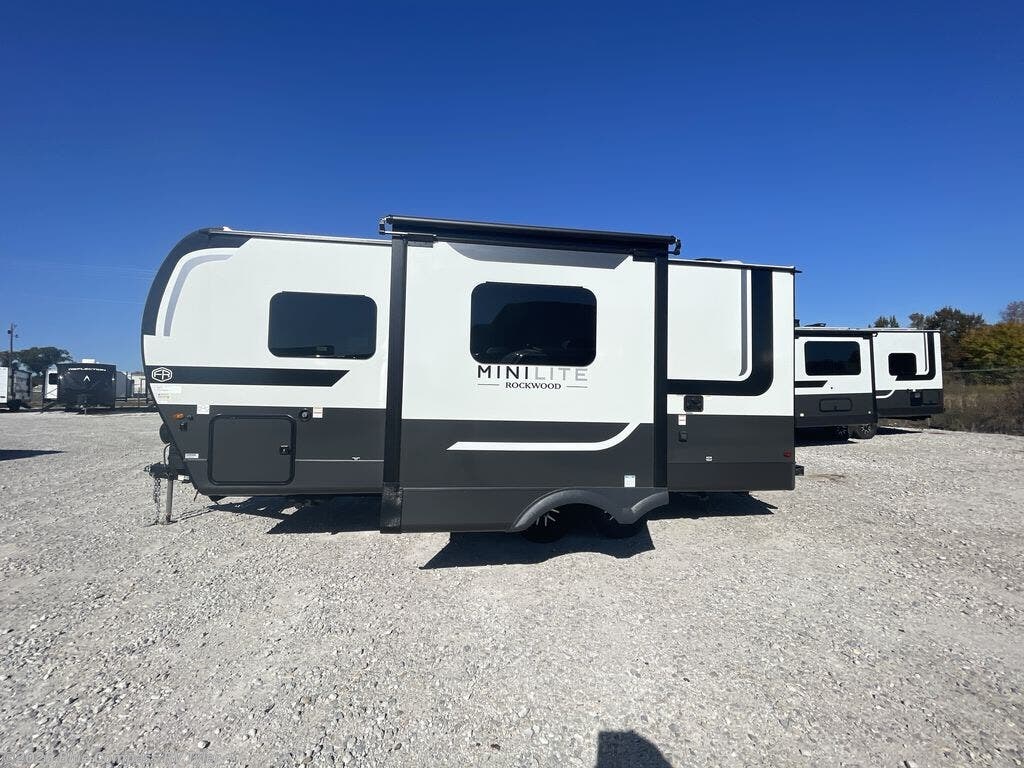 Each Rockwood Mini Lite travel trailer by Forest River is constructed with a fully laminated one-piece walkable roof, sleek frameless windows, and a six-sided full aluminum frame for strength and durability. The 12V thermostatically controlled heated tanks, plus radiant foil in the underbelly will allow you to camp well into the colder months, and the 200W roof solar panel will be perfect for a little off-gridding. Each model includes solid surface kitchen countertops, hidden hinge cabinet doors, roller shades, plus many more interior features. Having an AIR 360+ omnidirectional antenna with WiFi prep on board gives you the option to get some work done if it's needed, and the power tongue jack provides hassle-free set up, so you can enjoy more time relaxing!