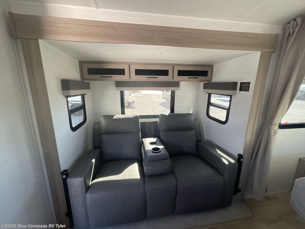 Enjoy the camping season with your spouse, friend, or significant other in this cozy travel trailer for two. Each morning, you can have your coffee on the 67" theater seats with a table within the slide out, then head outdoors to make pancakes on the outdoor griddle with an LP hookup. The interior kitchen includes a three burner cooktop, a microwave oven, plus a 12 volt refrigerator for perishables. An entertainment center with a fireplace will make your space feel more like home, and what's better than sleeping on your own queen bed with dual bedroom wardrobes for your clothes!?