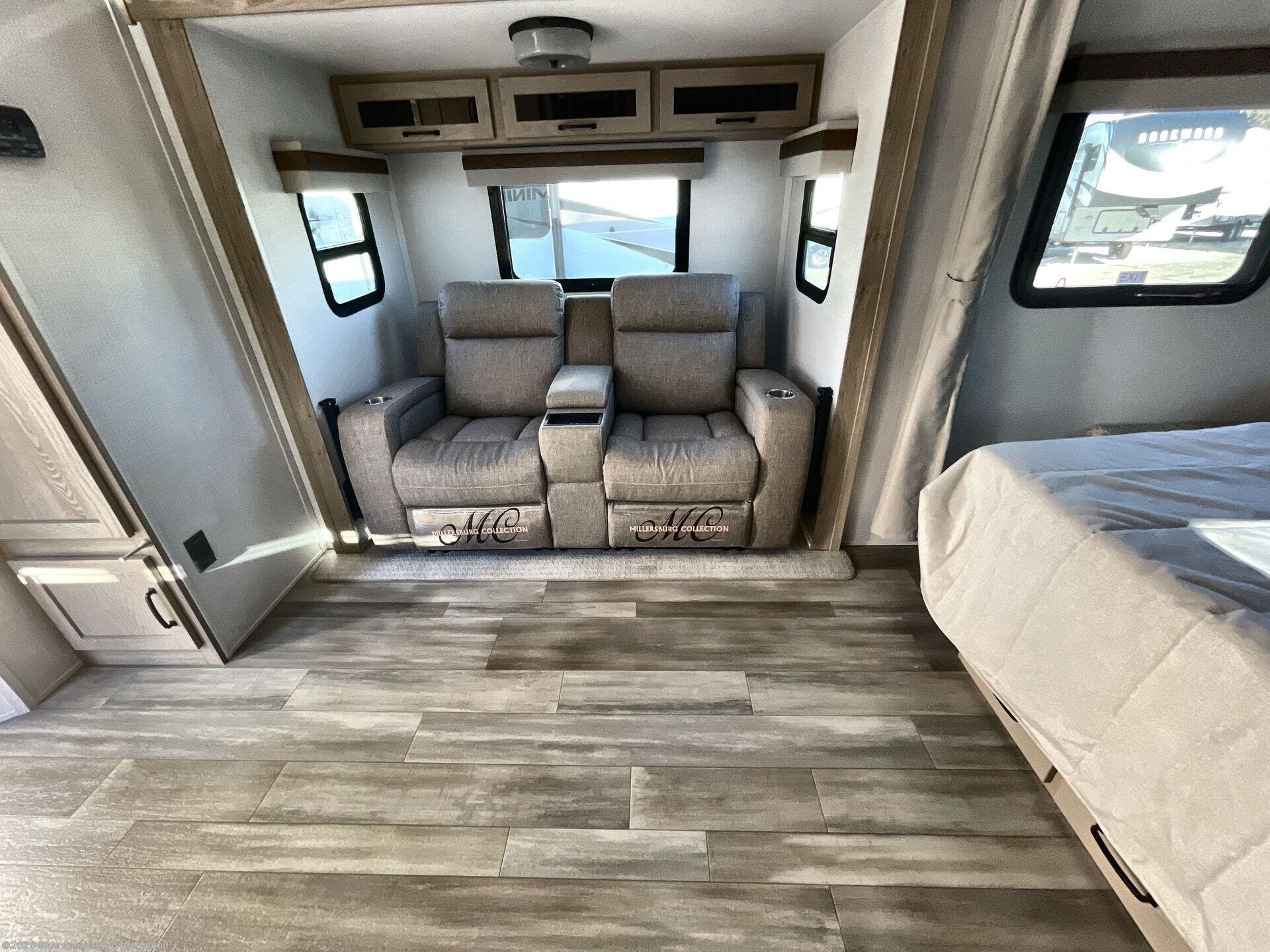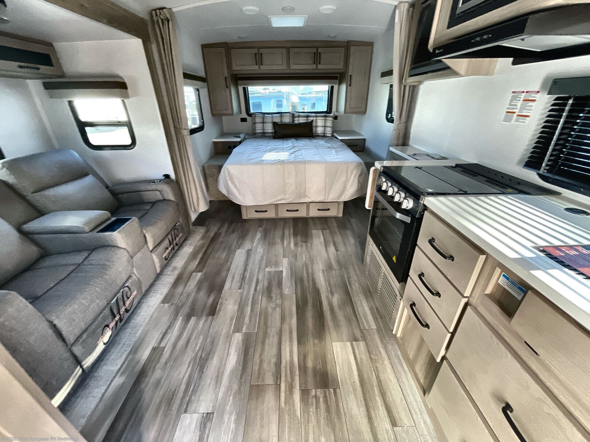 Enjoy the camping season with your spouse, friend, or significant other in this cozy travel trailer for two. Each morning, you can have your coffee on the 67" theater seats with tables within the slide out, then head outdoors to relax under the awning. The interior kitchen includes a three burner cooktop, a microwave oven, plus a 12 volt refrigerator for perishables. An entertainment center with a fireplace will make your space feel more like home, and what's better than sleeping on your own queen bed with dual bedroom wardrobes for your clothes!?