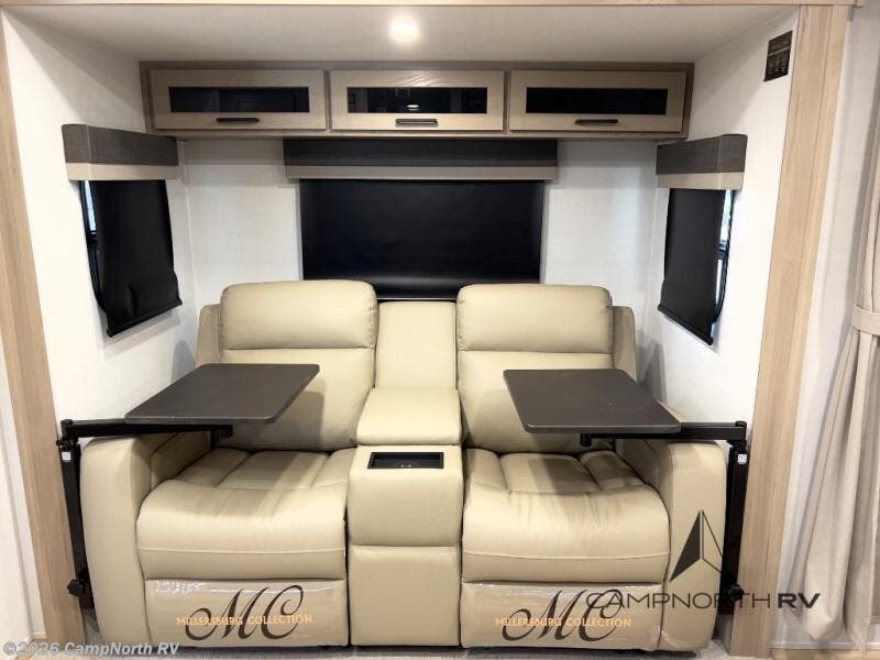 The slide out theater seating creates a comfortable living area for relaxing or enjoying movie nights, while the private queen bed provides a dedicated sleeping space with storage on both sides.