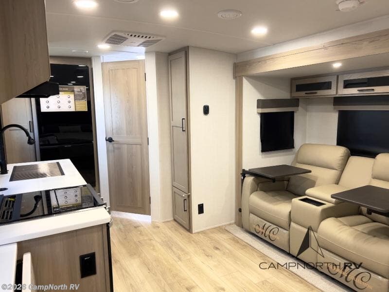 With theater seating, a fireplace, and a private queen bedroom, this model delivers residential-style comfort in a lightweight travel trailer design.