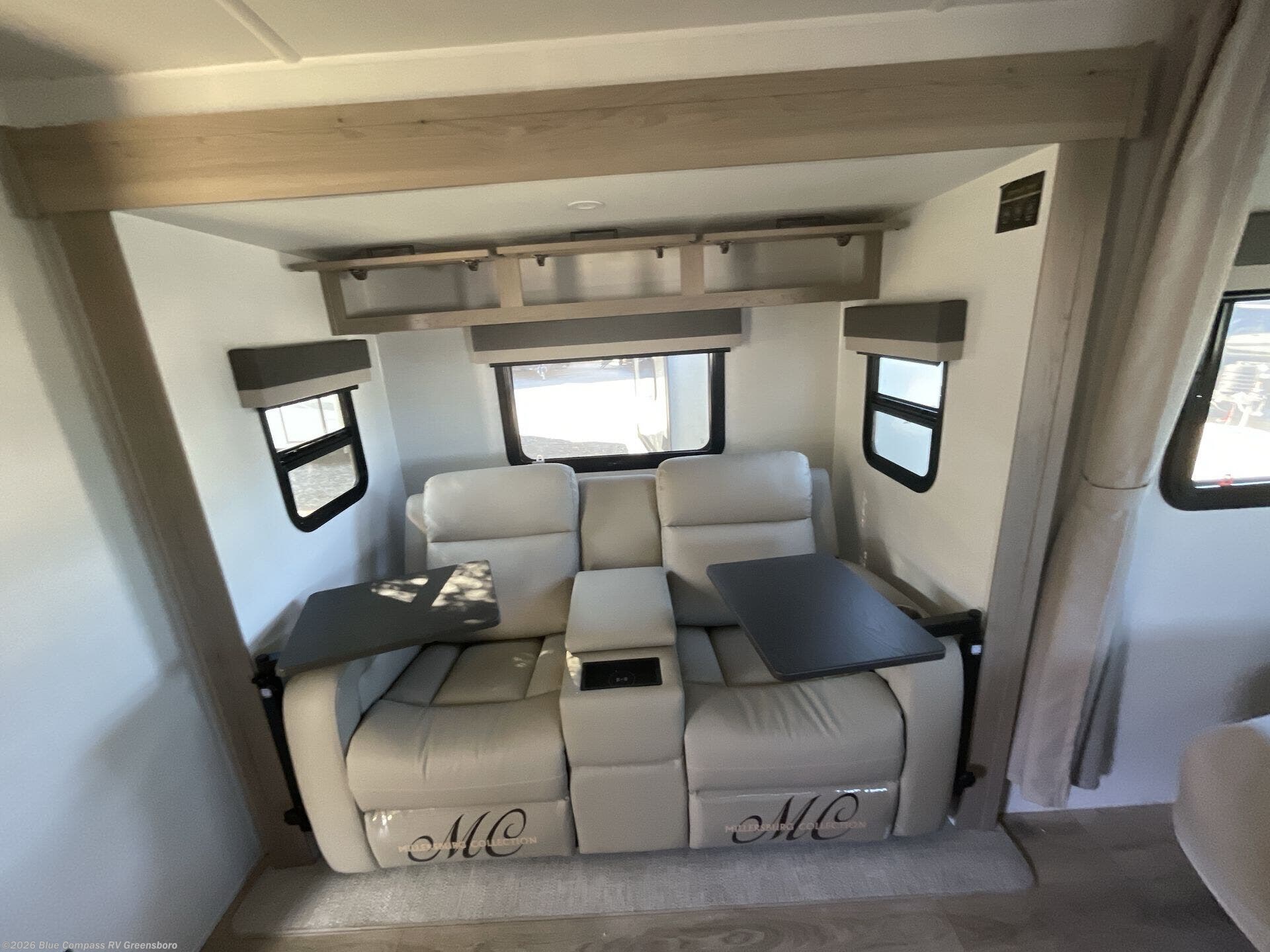 Enjoy the camping season with your spouse, friend, or significant other in this cozy travel trailer for two. Each morning, you can have your coffee on the 67" theater seats with tables within the slide out, then head outdoors to relax under the awning. The interior kitchen includes a three burner cooktop, a microwave oven, plus a 12 volt refrigerator for perishables. An entertainment center with a fireplace will make your space feel more like home, and what's better than sleeping on your own queen bed with dual bedroom wardrobes for your clothes!?