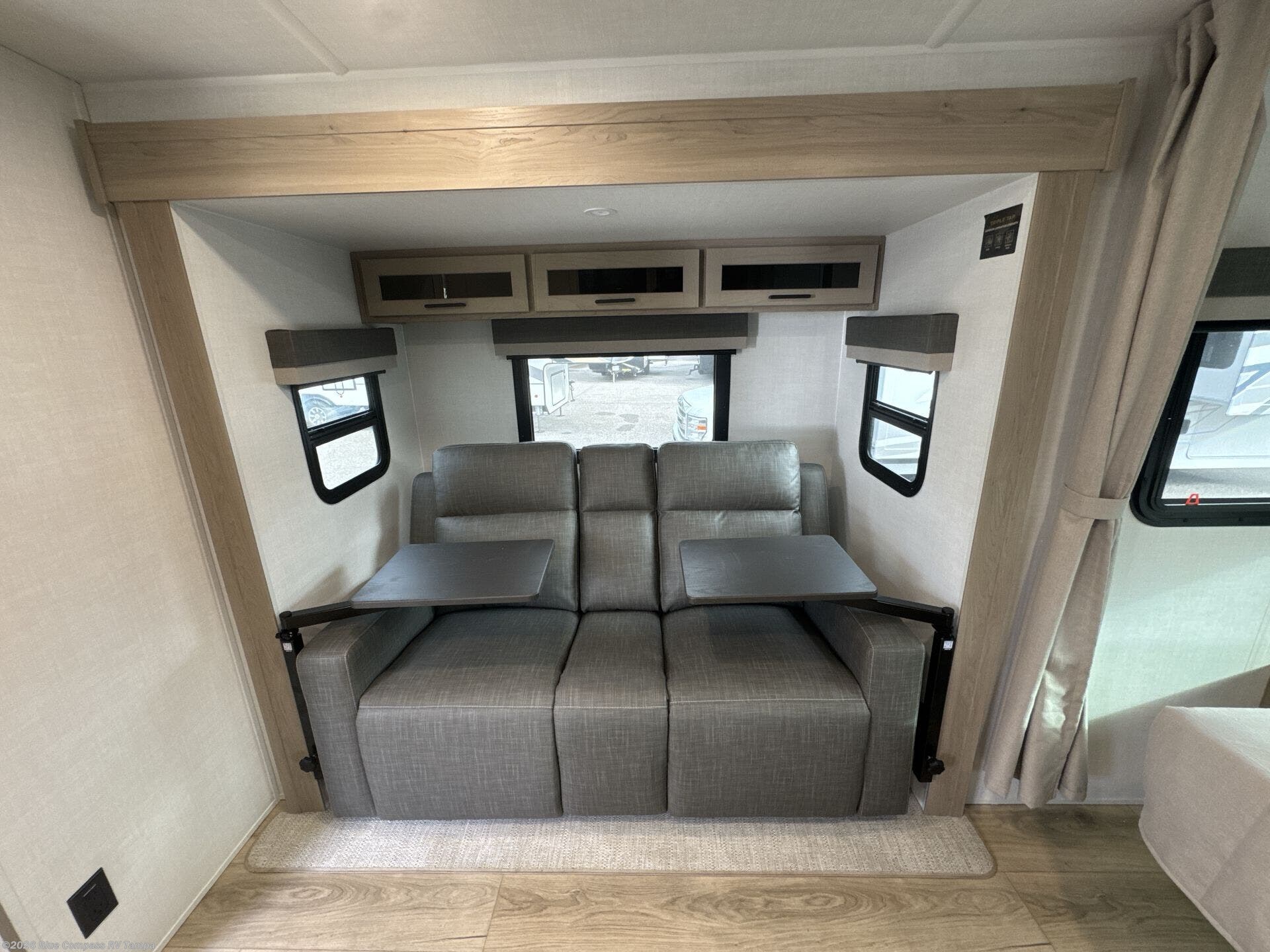 Enjoy the camping season with your spouse, friend, or significant other in this cozy travel trailer for two. Each morning, you can have your coffee on the 67" theater seats with tables within the slide out, then head outdoors to relax under the awning. The interior kitchen includes a three burner cooktop, a microwave oven, plus a 12 volt refrigerator for perishables. An entertainment center with a fireplace will make your space feel more like home, and what's better than sleeping on your own queen bed with dual bedroom wardrobes for your clothes!?