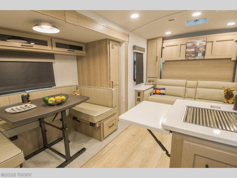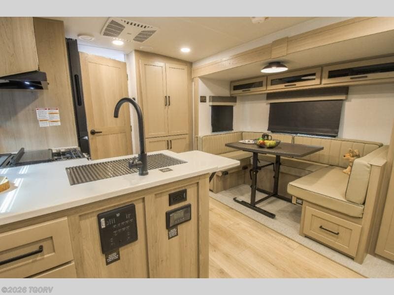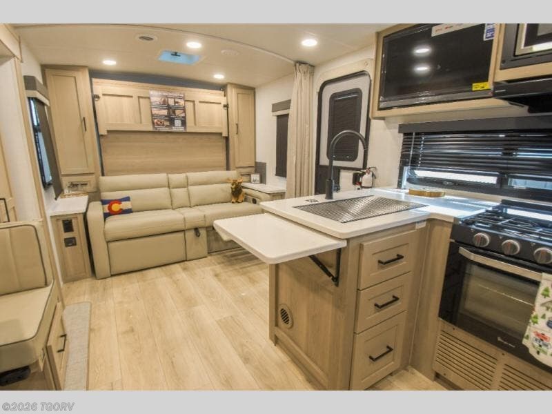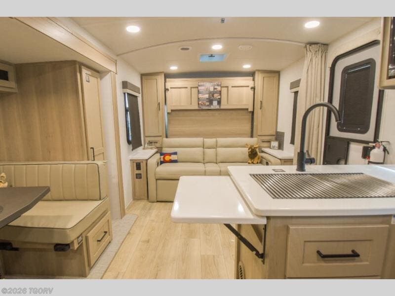 This versatile and cozy travel trailer will be perfect for weekend trips to the lake. Once you arrive at your campground, you can unload the water toys from the pass-thru storage, put out the 15' power awning, then make lunch on the exterior griddle. The U-shaped dinette slide inside will provide a place to dine, play board games, and let a guest or two sleep over, while you take the RV queen-size Murphy bed up front. In the morning, just fold up the bed to expose the 74" sofa! There is a three burner cooktop and microwave oven in the kitchen to make meals each day, along with a 12V refrigerator to keep leftovers fresh.