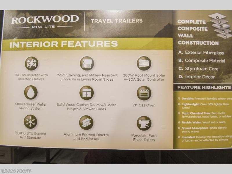 Each Rockwood Mini Lite travel trailer by Forest River is constructed with a fully laminated one-piece walkable roof, sleek frameless windows, and a six-sided full aluminum frame for strength and durability. The 12V thermostatically controlled heated tanks, plus radiant foil in the underbelly will allow you to camp well into the colder months, and the 200W roof solar panel will be perfect for a little off-gridding. Each model includes solid surface kitchen countertops, hidden hinge cabinet doors, roller shades, plus many more interior features. Having an AIR 360+ omnidirectional antenna with WiFi prep on board gives you the option to get some work done if it's needed, and the power tongue jack provides hassle-free set up, so you can enjoy more time relaxing!