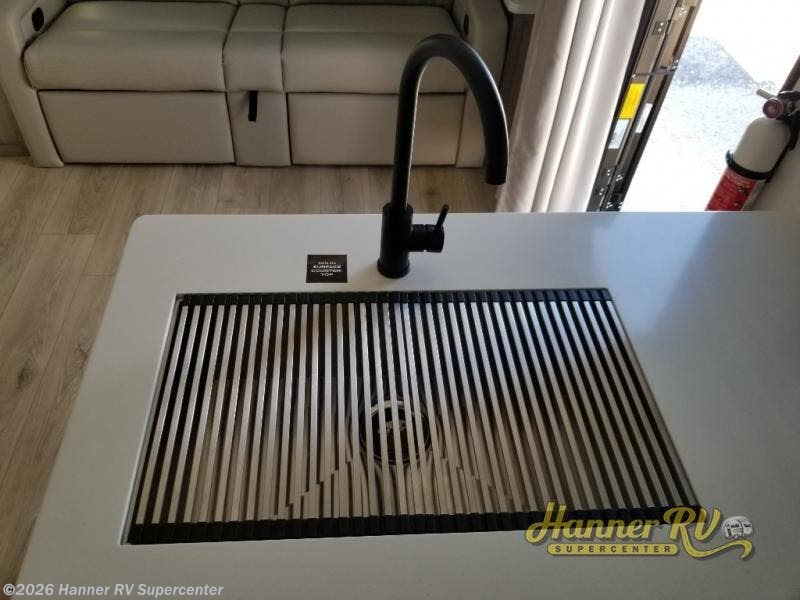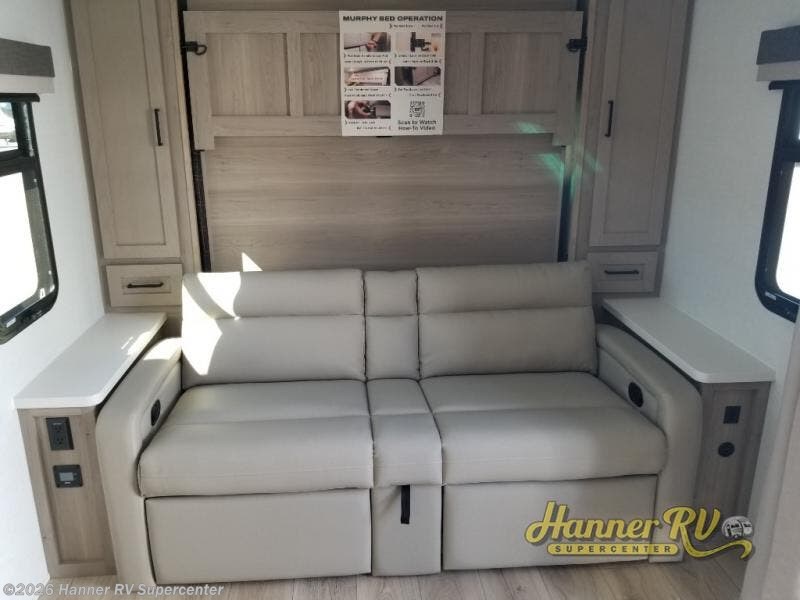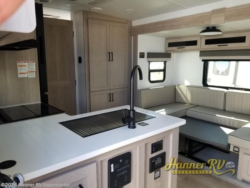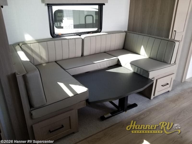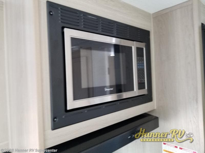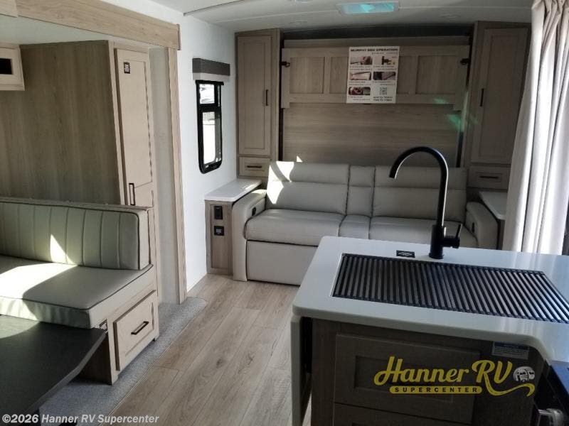 This versatile and cozy travel trailer will be perfect for weekend trips to the lake. Once you arrive at your campground, you can unload the water toys from the pass-thru storage, put out the 15' power awning, then make lunch on the exterior griddle. The U-shaped dinette slide inside will provide a place to dine, play board games, and let a guest or two sleep over, while you take the RV queen-size Murphy bed up front. In the morning, just fold up the bed to expose the 74" sofa! There is a three burner cooktop and microwave oven in the kitchen to make meals each day, along with a 12V refrigerator to keep leftovers fresh.