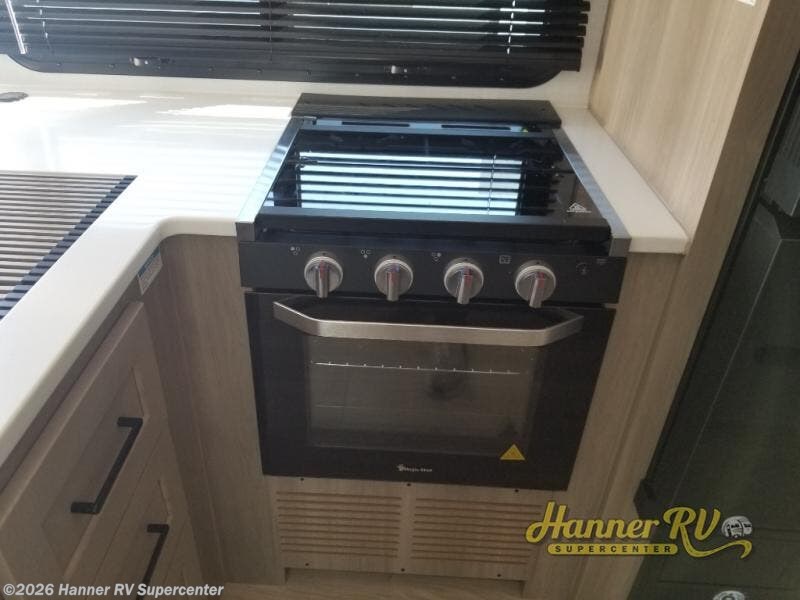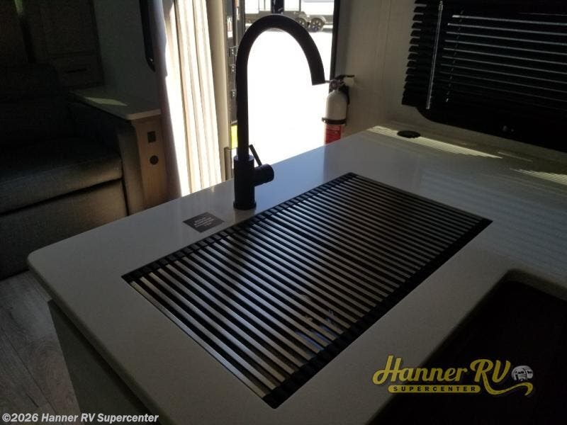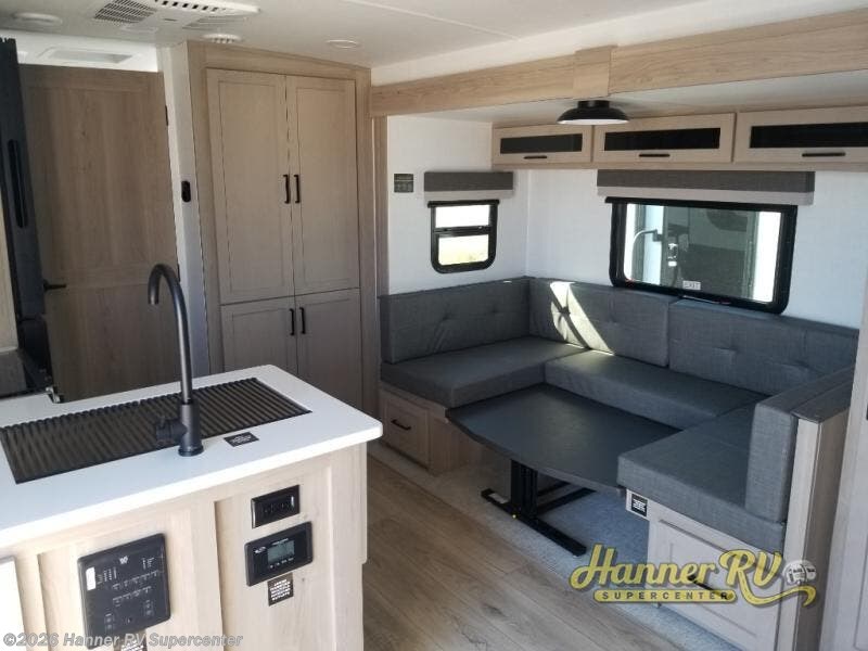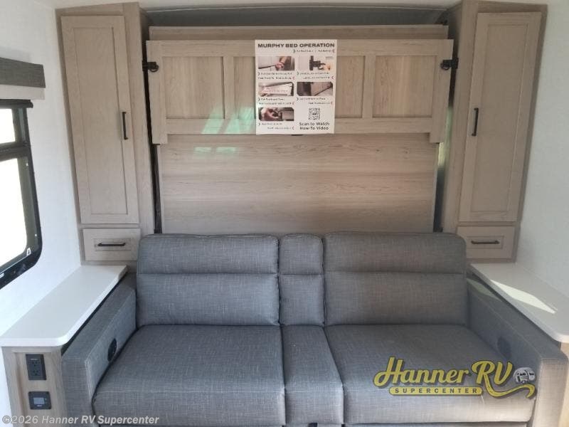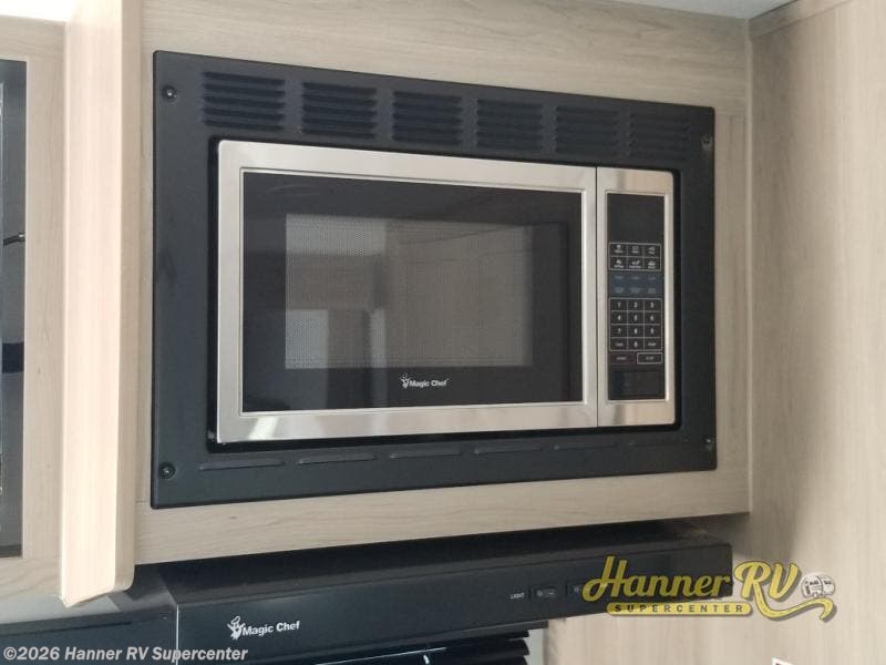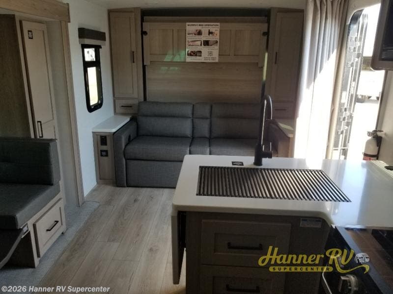 This versatile and cozy travel trailer will be perfect for weekend trips to the lake. Once you arrive at your campground, you can unload the water toys from the pass-thru storage, put out the 15' power awning, then make lunch on the exterior griddle. The U-shaped dinette slide inside will provide a place to dine, play board games, and let a guest or two sleep over, while you take the RV queen-size Murphy bed up front. In the morning, just fold up the bed to expose the 74" sofa! There is a three burner cooktop and microwave oven in the kitchen to make meals each day, along with a 12V refrigerator to keep leftovers fresh.