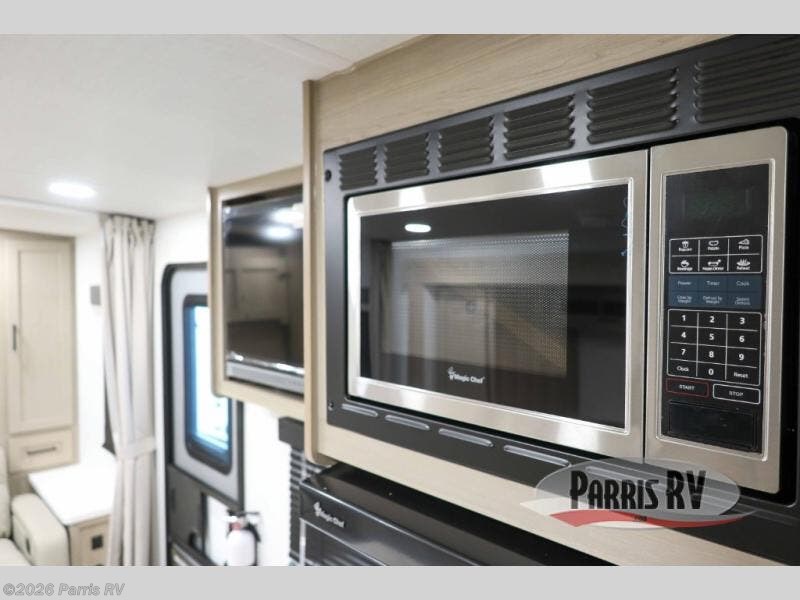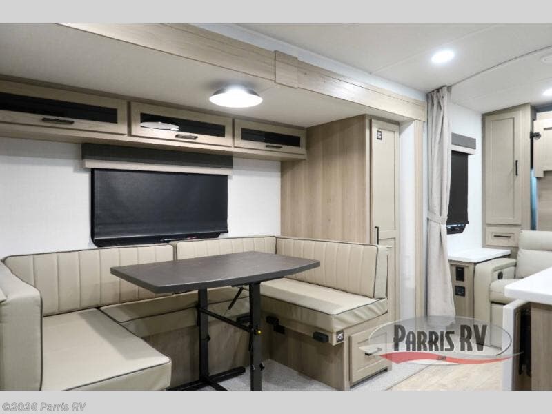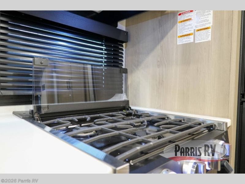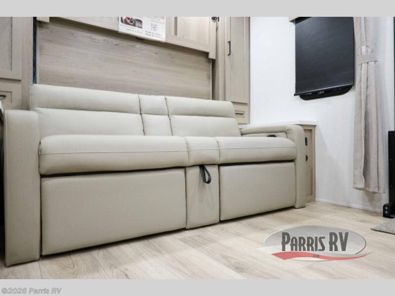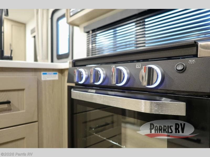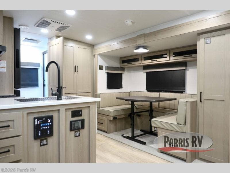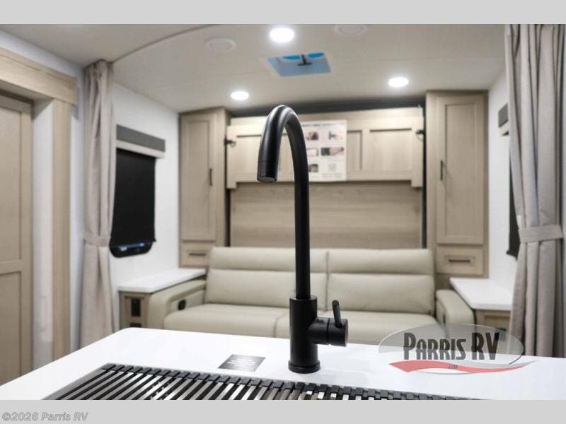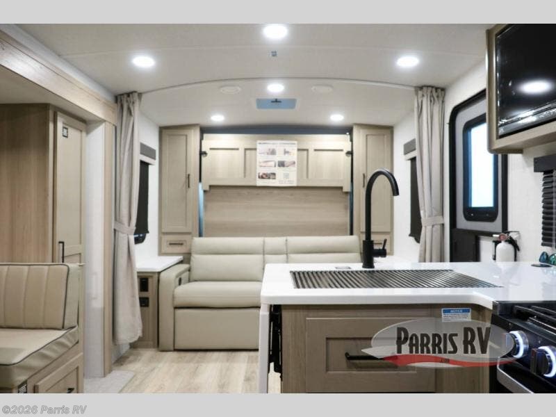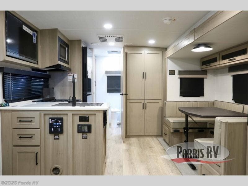 This versatile and cozy travel trailer will be perfect for weekend trips to the lake. Once you arrive at your campground, you can unload the water toys from the pass-thru storage, put out the 15' power awning, then make lunch on the exterior griddle. The U-shaped dinette slide inside will provide a place to dine, play board games, and let a guest or two sleep over, while you take the RV queen-size Murphy bed up front. In the morning, just fold up the bed to expose the 74" sofa! There is a three burner cooktop and microwave oven in the kitchen to make meals each day, along with a 12V refrigerator to keep leftovers fresh.