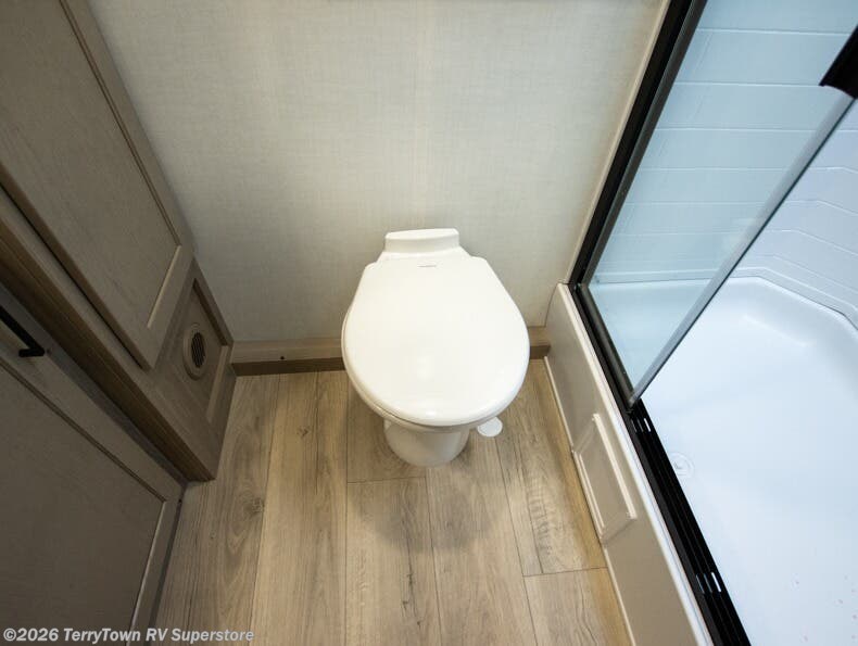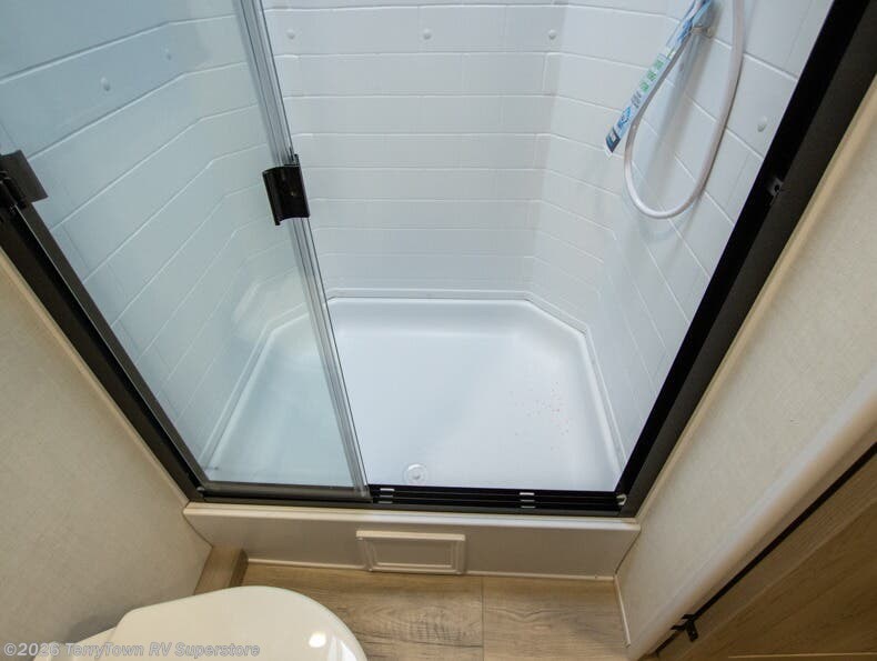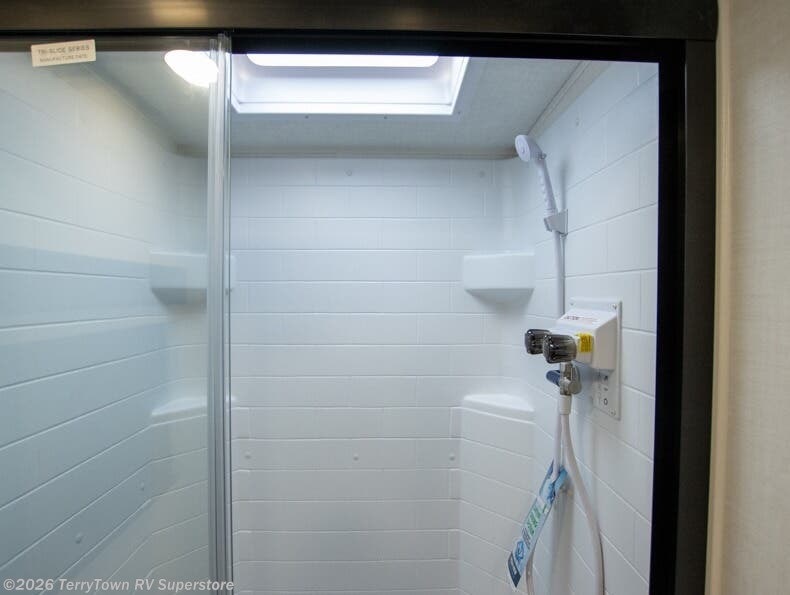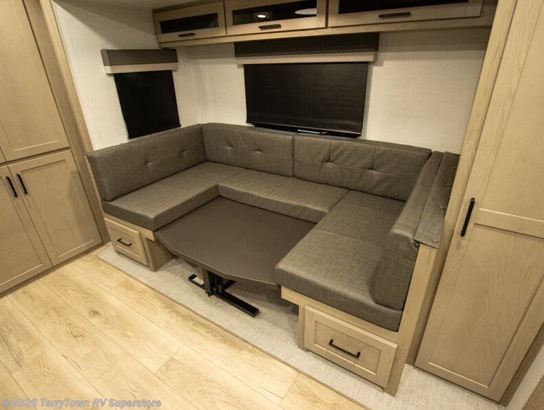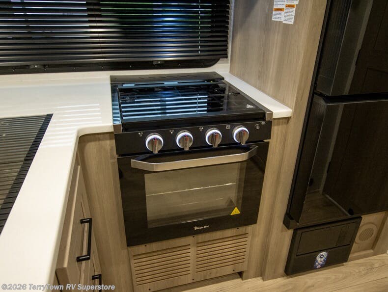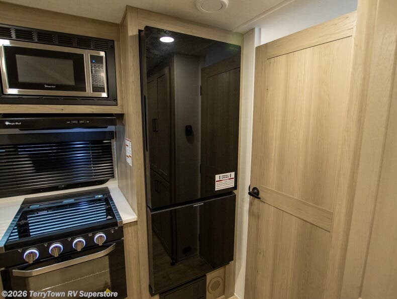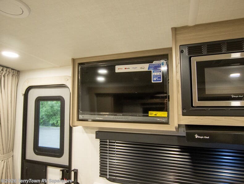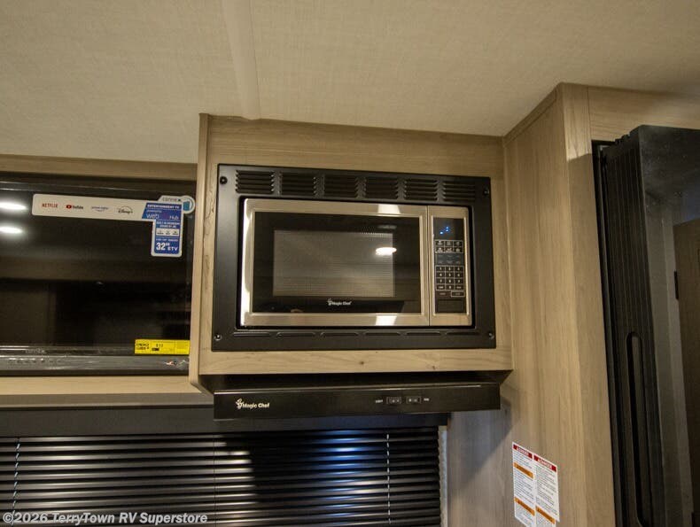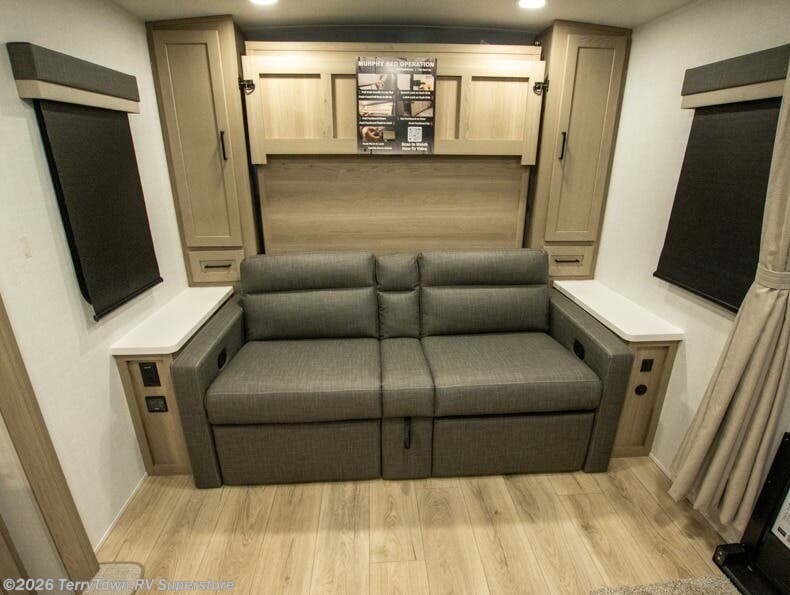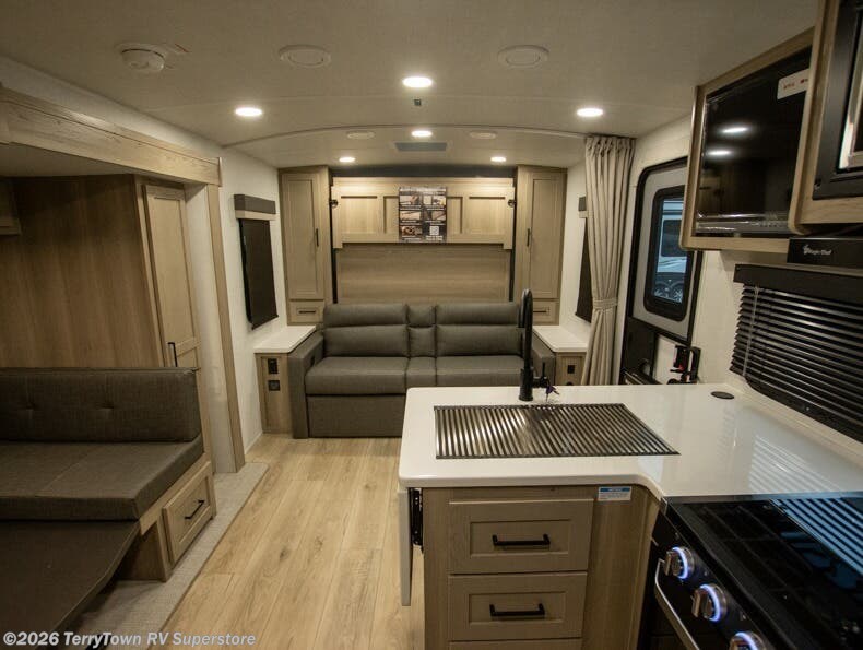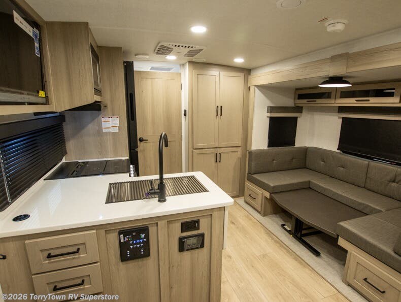 This versatile and cozy travel trailer will be perfect for weekend trips to the lake. Once you arrive at your campground, you can unload the water toys from the pass-thru storage, put out the 15' power awning, then make lunch on the exterior griddle. The U-shaped dinette slide inside will provide a place to dine, play board games, and let a guest or two sleep over, while you take the RV queen-size Murphy bed up front. In the morning, just fold up the bed to expose the 74" sofa! There is a three burner cooktop and microwave oven in the kitchen to make meals each day, along with a 12V refrigerator to keep leftovers fresh.
