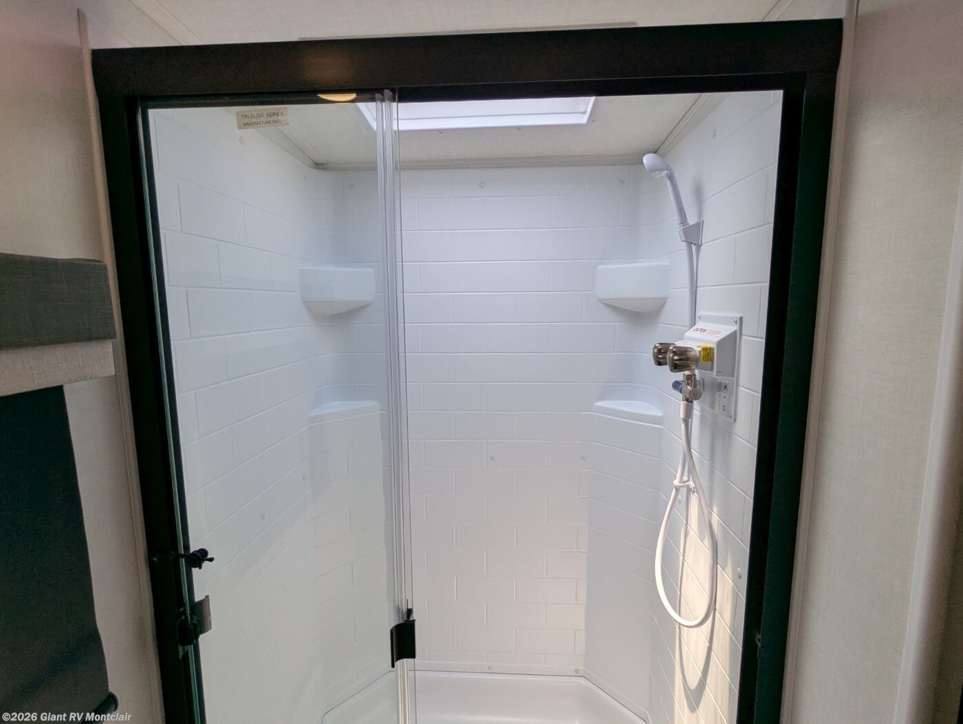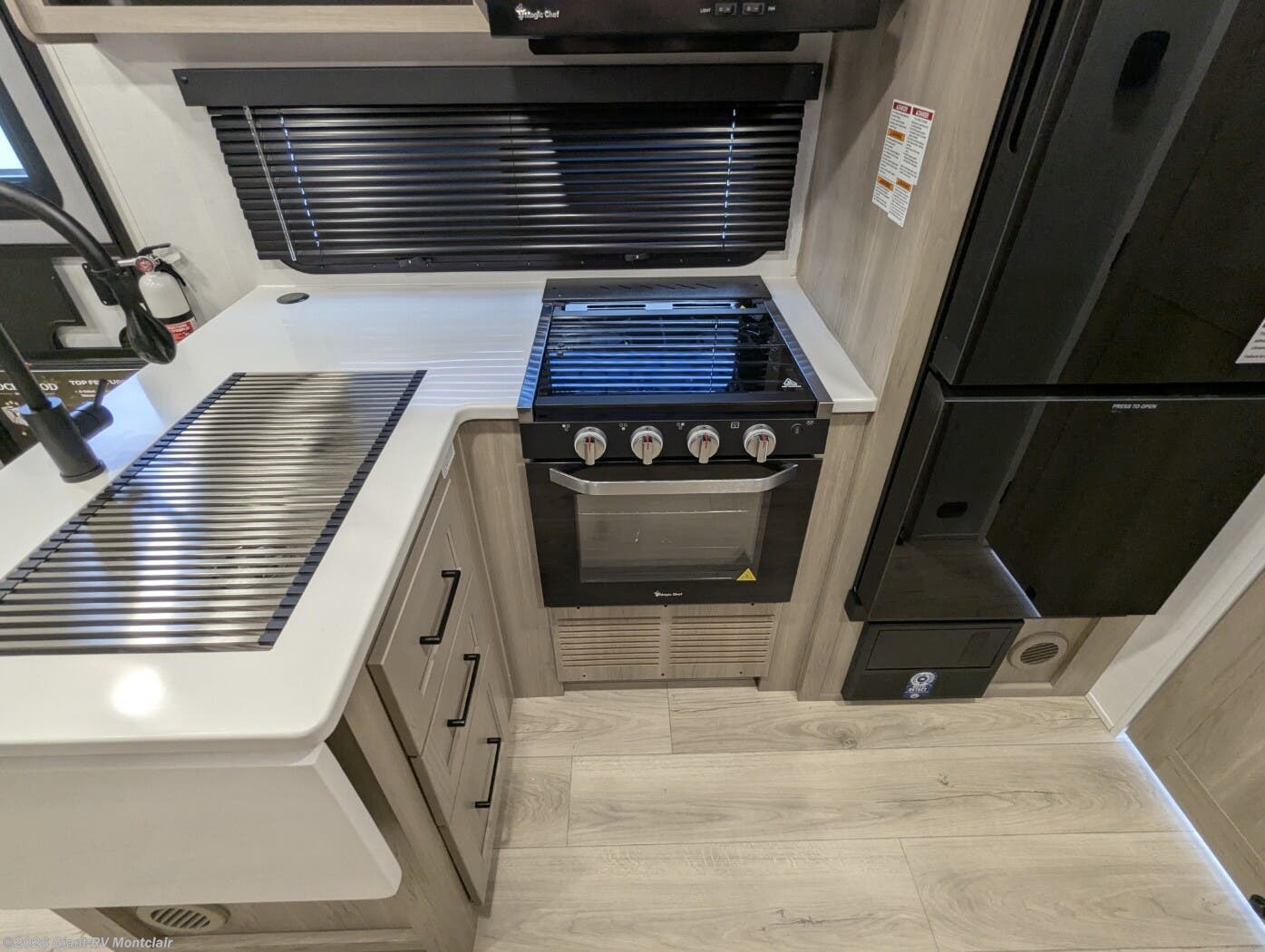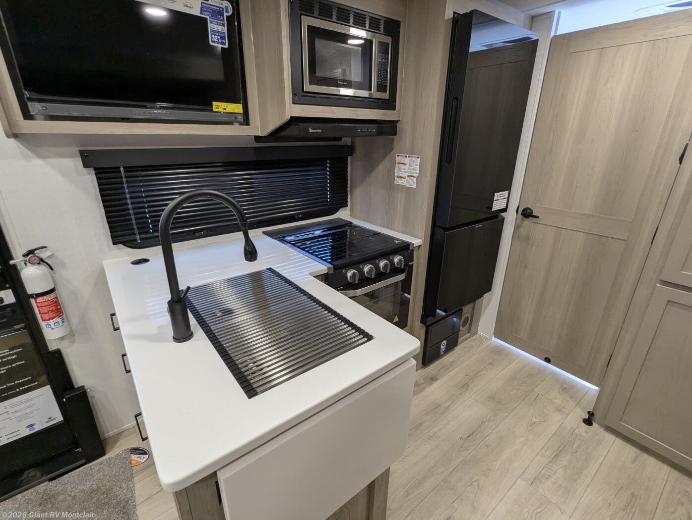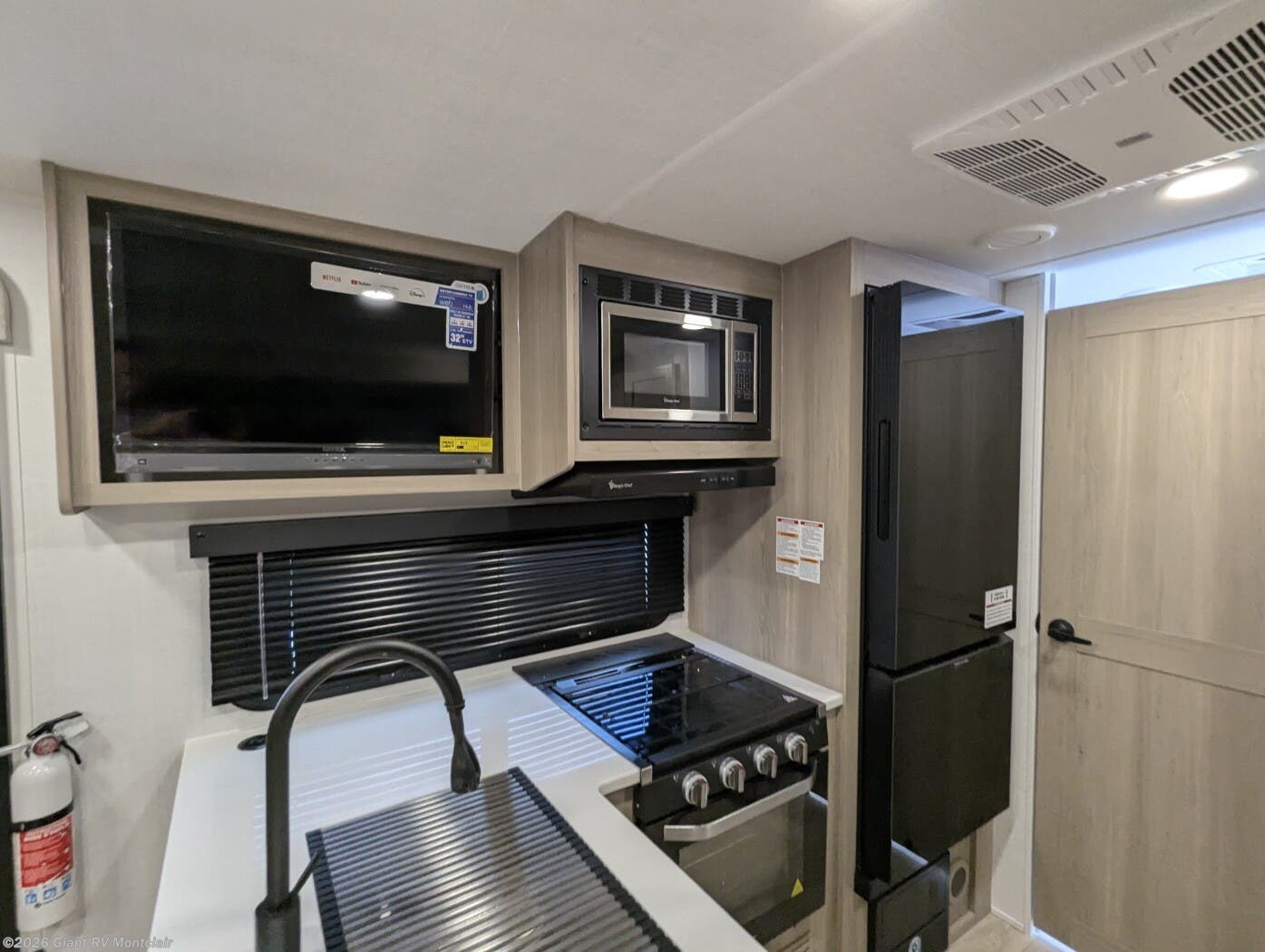 Modern Amenities: Features air conditioning, a kitchen with a 12V refrigerator, exterior griddle, 32” TV, and a fireplace for cozy evenings.