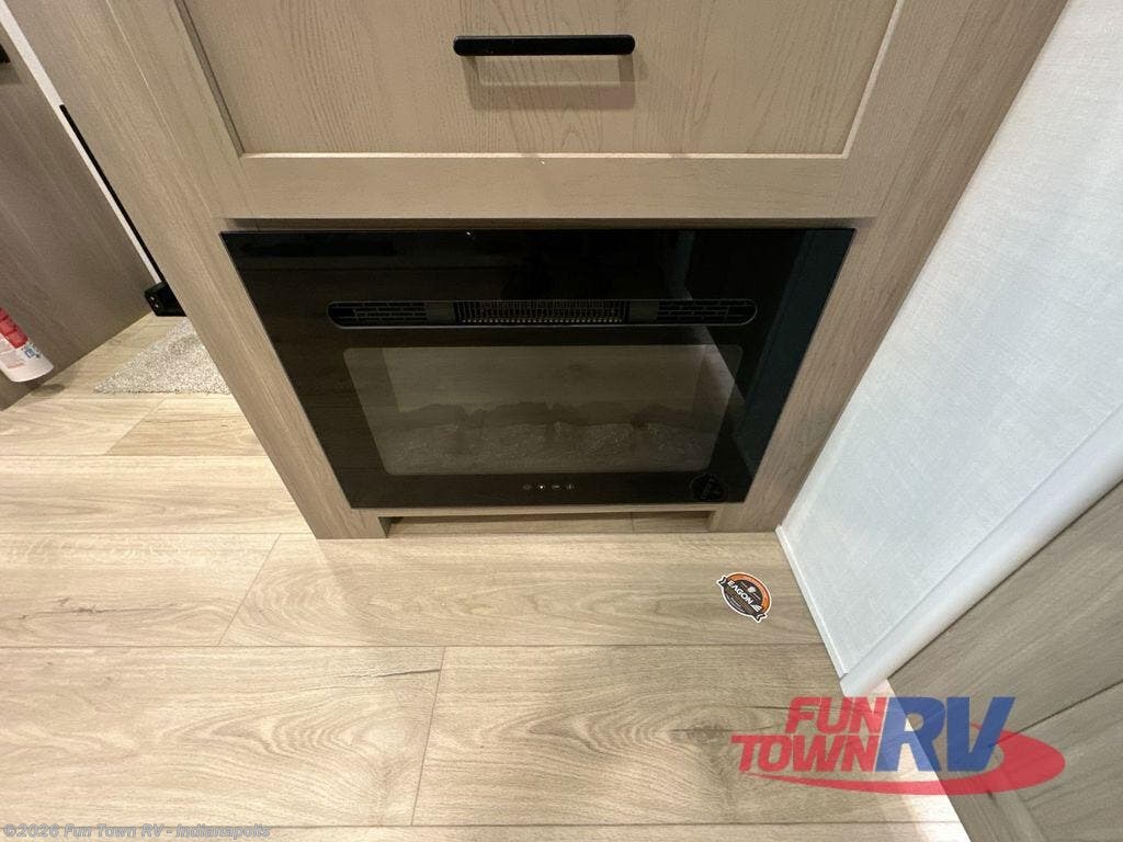 If you like the front kitchen layout, you're going to love this one! You'll have plenty of counter space to prepare and cook meals, or you may just want to head outdoors to cook on the outside griddle. There is a 19' power awning with LED lights to keep you protected from the sun and rain, and there are three exterior storage compartments for lawn chairs, fishing poles, and firewood! This model includes a U-shaped dinette slide in perfect view of the 12V smart entertainment TV and fireplace, and this area can double as your guests' sleeping space at night. You'll stay comfortable in the rear bedroom that includes an RV queen bed, dual bedroom wardrobes, and an optional TV if you enjoy movies in bed!