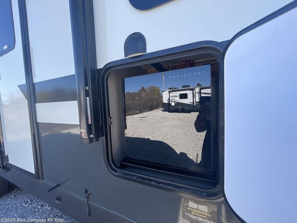 If you like the front kitchen layout, you're going to love this one! You'll have plenty of counter space to prepare and cook meals, or you may just want to head outdoors to cook on the outside griddle. There is a 19' power awning with LED lights to keep you protected from the sun and rain, and there are three exterior storage compartments for lawn chairs, fishing poles, and firewood! This model includes a U-shaped dinette slide in perfect view of the 12V smart entertainment TV and fireplace, and this area can double as your guests' sleeping space at night. You'll stay comfortable in the rear bedroom that includes an RV queen bed, dual bedroom wardrobes, and an optional TV if you enjoy movies in bed!