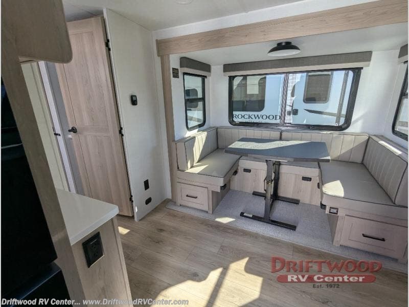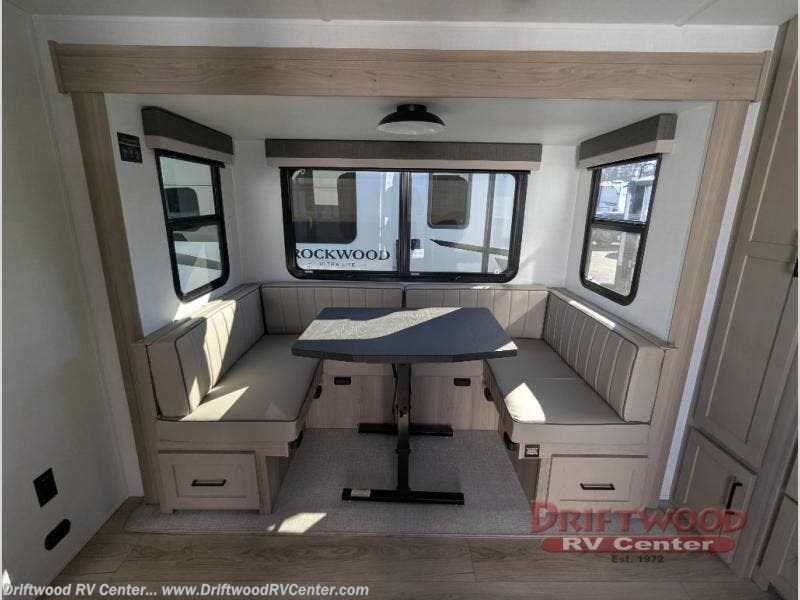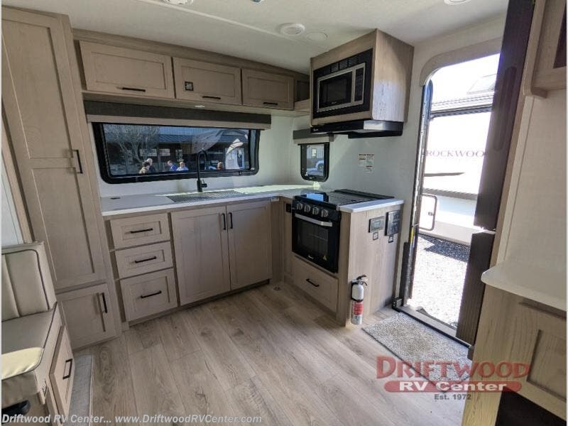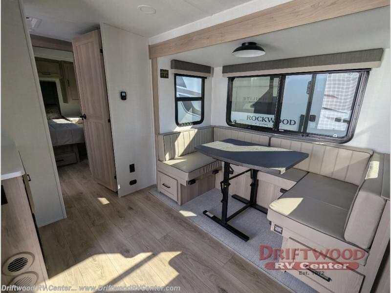 Each Rockwood Mini Lite travel trailer by Forest River is constructed with a fully laminated one-piece walkable roof, sleek frameless windows, and a six-sided full aluminum frame for strength and durability. The 12V thermostatically controlled heated tanks, plus radiant foil in the underbelly will allow you to camp well into the colder months, and the 200W roof solar panel will be perfect for a little off-gridding. Each model includes solid surface kitchen countertops, hidden hinge cabinet doors, roller shades, plus many more interior features. Having an AIR 360+ omnidirectional antenna with WiFi prep on board gives you the option to get some work done if it's needed, and the power tongue jack provides hassle-free set up, so you can enjoy more time relaxing!