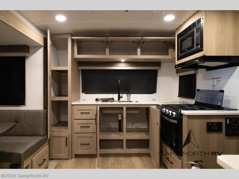 The front kitchen provides more prep space than traditional travel trailers, making it easier to cook and entertain at the campground. The U shaped dinette slide expands the living area, while the rear bedroom provides a comfortable sleeping space with wardrobe storage on both sides.