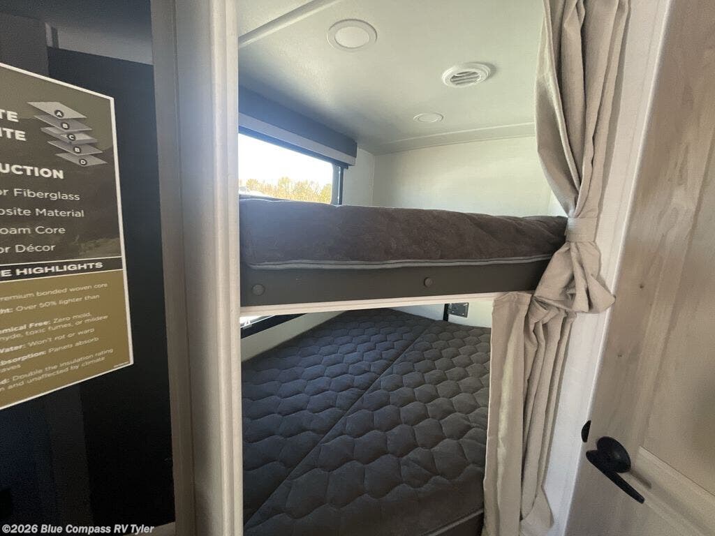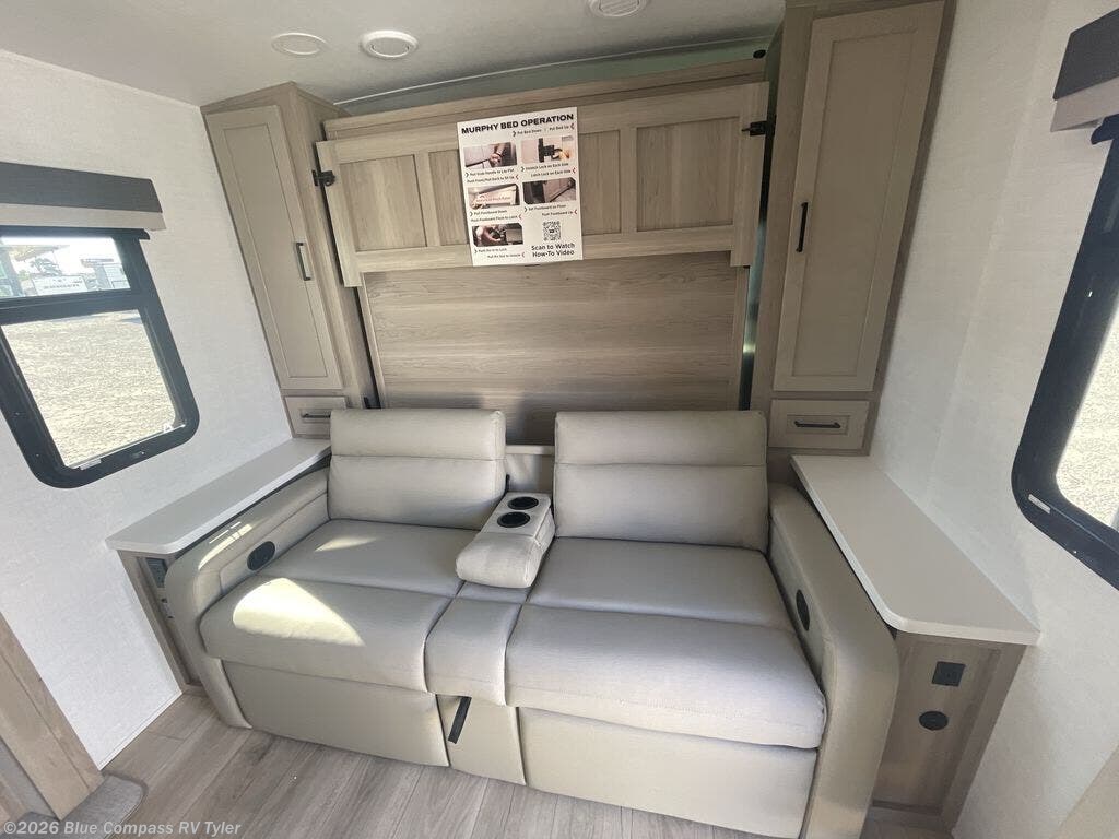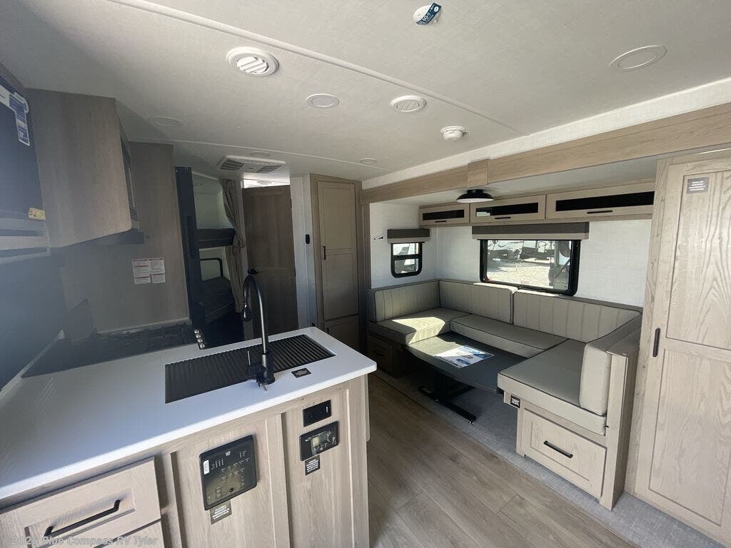 Finally, a lightweight travel trailer with double-size bunks for the kids or your guests! You'll find the versatile Murphy bed up front will be super convenient when you need more space to move around, and the 72" sofa will provide comfy seating space when the bed is put up. This model also includes a U-shaped dinette slide perfect to dine around, play games, and sleep additional guests. A 32" TV in the main living area will allow you to watch your favorite shows in the evenings, or you may just find yourselves outdoors under the 18' power awning with LED lights. And check out the pass-through storage, plus additional exterior storage for your hiking gear!