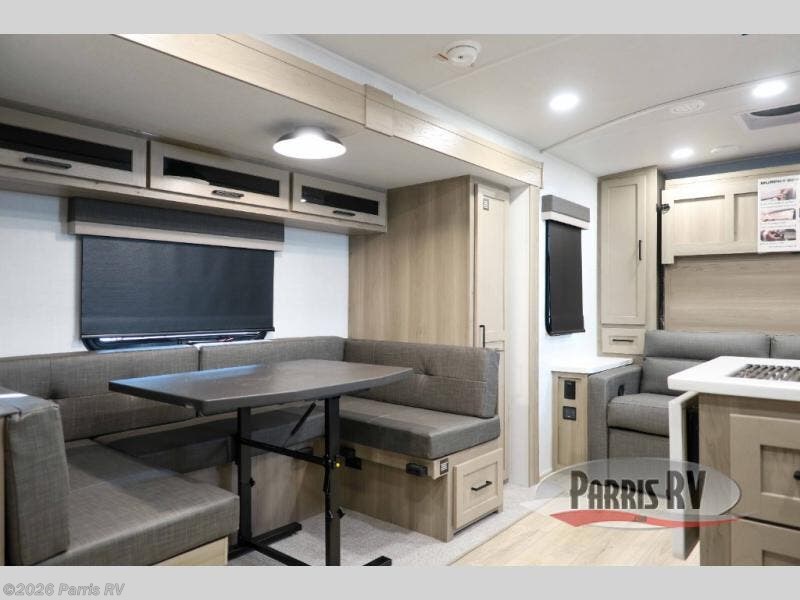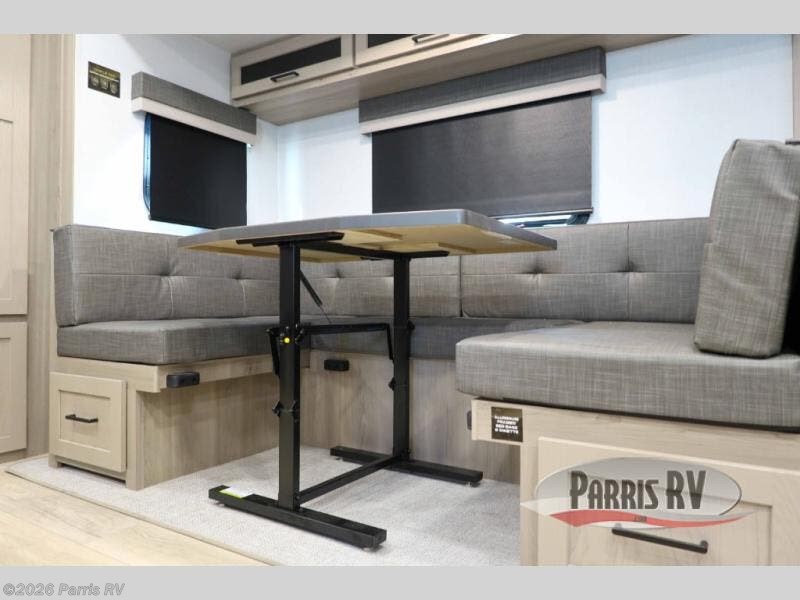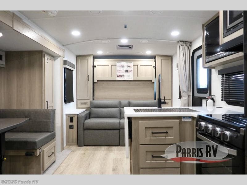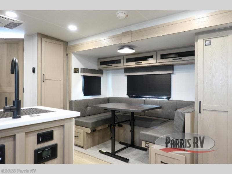 Finally, a lightweight travel trailer with double-size bunks for the kids or your guests! You'll find the versatile Murphy bed up front will be super convenient when you need more space to move around, and the 72" sofa will provide comfy seating space when the bed is put up. This model also includes a U-shaped dinette slide perfect to dine around, play games, and sleep additional guests. A 32" TV in the main living area will allow you to watch your favorite shows in the evenings, or you may just find yourselves outdoors under the 18' power awning with LED lights. And check out the pass-through storage, plus additional exterior storage for your hiking gear!