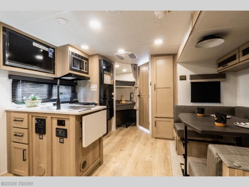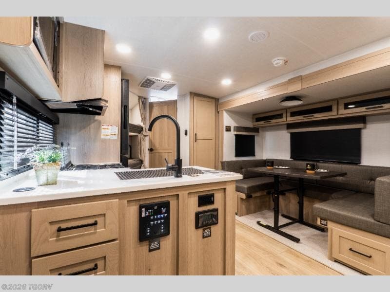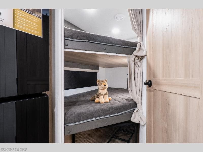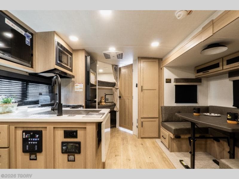 Toward the rear, the double-size bunks offer comfortable sleeping for kids or guests, making this layout ideal for families. The full bath provides everything you need to stay clean and refreshed on the road. Outside, the outside kitchen adds extra cooking flexibility, while the 18' power awning with LED lights creates a shaded space to relax. You'll also appreciate the pass-through and additional exterior storage for all your gear.