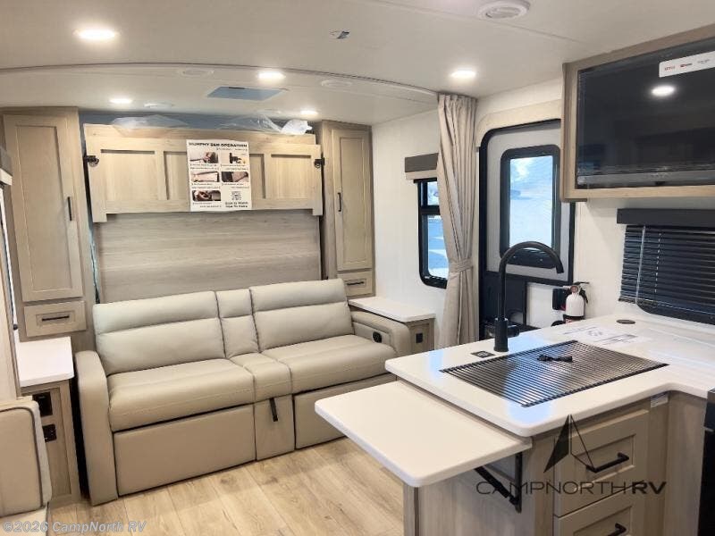 The Murphy bed design allows the front living area to convert from seating to sleeping, creating more usable space during the day. The double size bunks and slide-out dinette provide additional sleeping for family or guests, making this floorplan ideal for families.