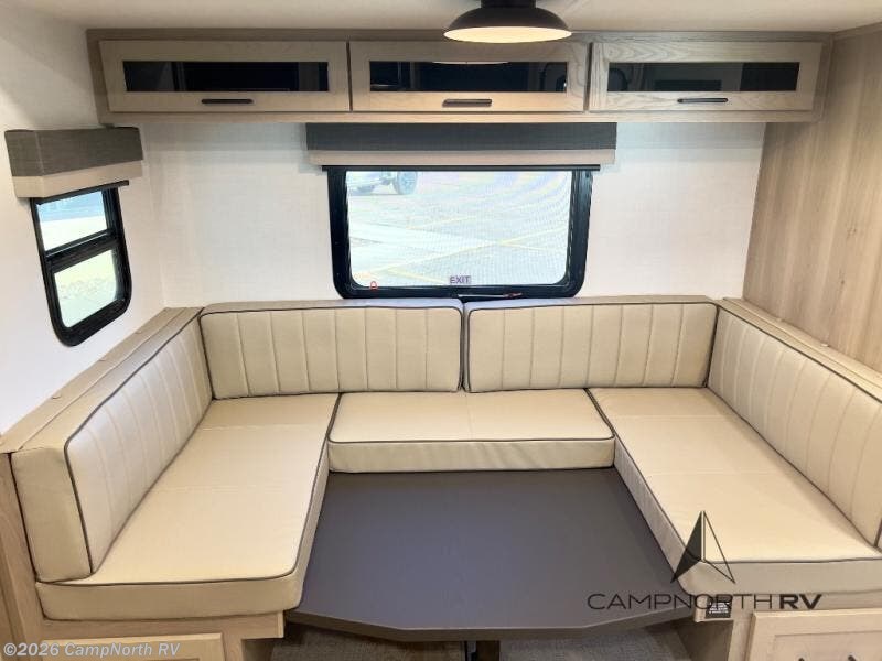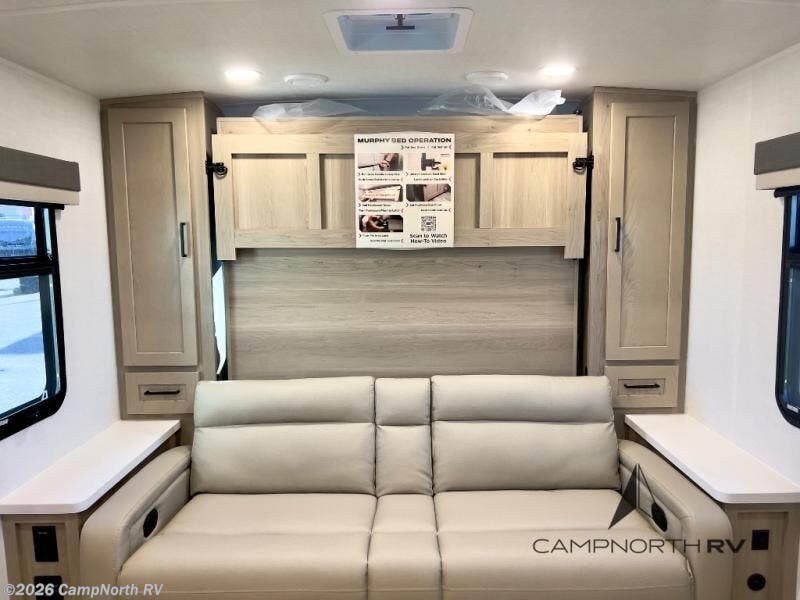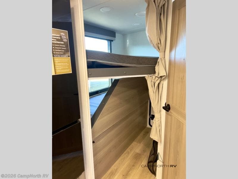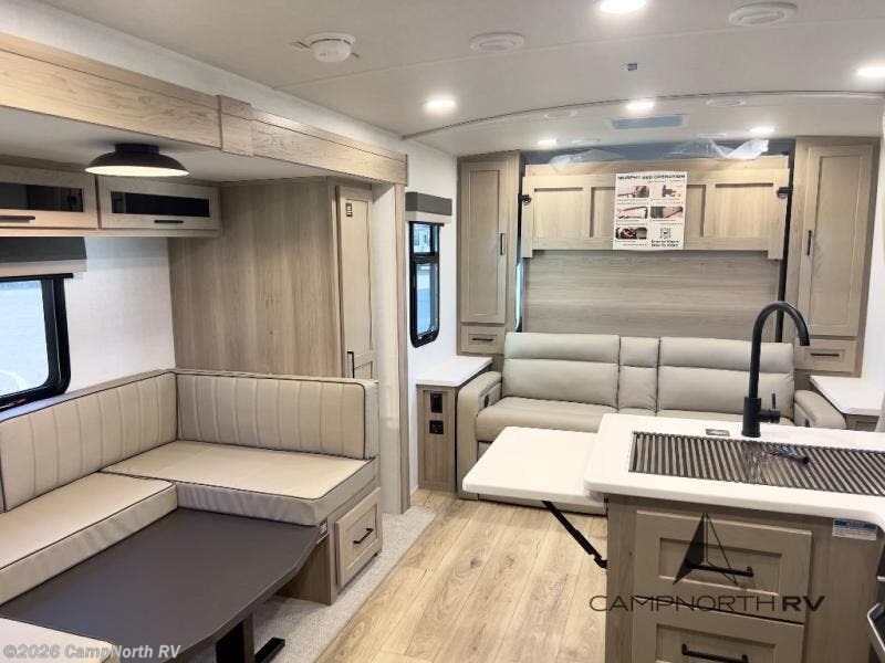 Finally, a lightweight travel trailer with double-size bunks for the kids or your guests! You'll find the versatile Murphy bed up front will be super convenient when you need more space to move around, and the 72" sofa will provide comfy seating space when the bed is put up. This model also includes a U-shaped dinette slide perfect to dine around, play games, and sleep additional guests. A 32" TV in the main living area will allow you to watch your favorite shows in the evenings, or you may just find yourselves outdoors under the 18' power awning with LED lights. And check out the pass-through storage, plus additional exterior storage for your hiking gear!