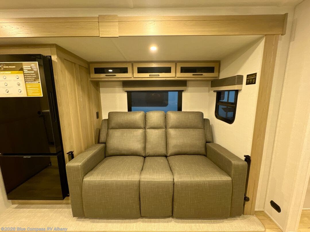 Camping trips to the lake just got sweeter with this dual slide out travel trailer in tow! Once you arrive, unload your gear from the exterior drop-frame pass-through storage, then start lunch on the exterior griddle. If you need a rest after traveling all day, the RV queen bed in the front bedroom is sure to give you comfort, or you can relax on the theater seating. The fireplace and entertainment center with a 32" TV will make this space feel just like home, and check out the spacious full rear bath for added privacy. This model also includes an entryway closet/pantry for jackets, shoes, and food!