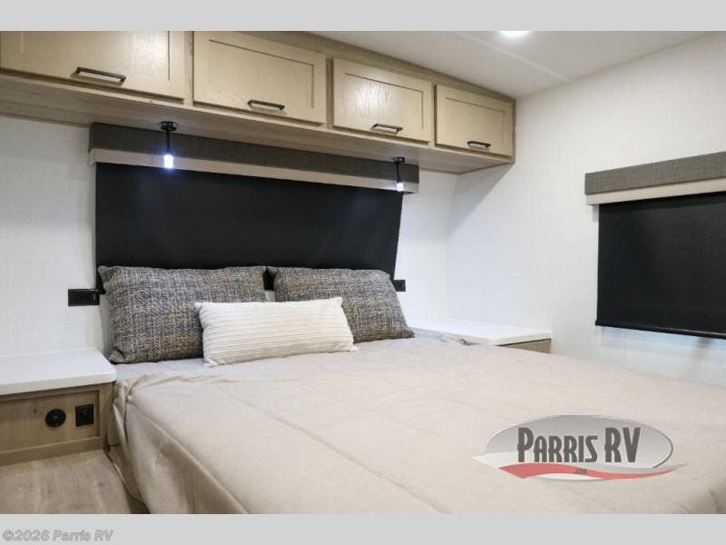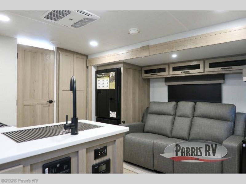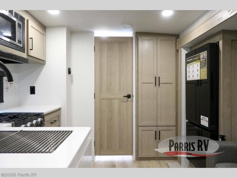 This is the perfect travel trailer for two people looking for comfortable camping trips! You will have your own RV queen bed to sleep on in the front private bedroom, and an optional TV can be added if you enjoy the morning news in bed. Breakfast can be made on the three burner cooktop, or head outdoors to cook on the outside kitchen. The theater seating with a table will provide a place to relax and dine together, and the spacious full rear bath will allow you to clean up before you head out for the day. This model includes plenty of storage space, including two pantries, a wardrobe slide out in the bedroom, plus a drop-frame pass-through storage for larger camp gear!