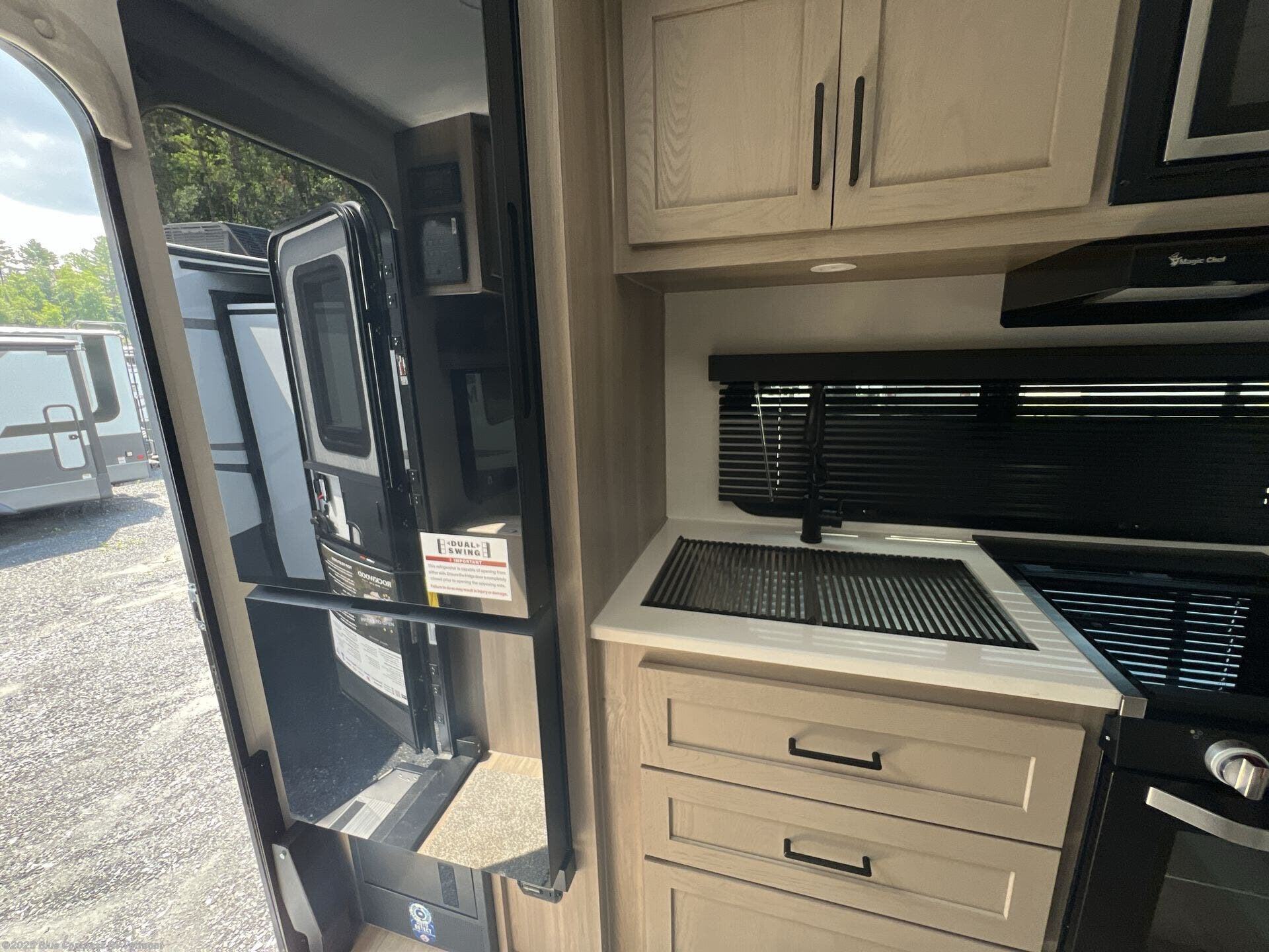 You and your spouse will have a great time camping in this travel trailer! You will have your own RV queen bed to sleep on in the front private bedroom, and an optional TV can be added if you enjoy the morning news in bed. Breakfast can be made on the three burner cooktop in the rear kitchen, or head outdoors to cook on the outside griddle. The 67" theater seating with cupholders will provide a place to relax and dine together, and the spacious walk-through bath will allow you to clean up before you head out for the day. This model includes plenty of storage space, including a pantry for your snacks, a wardrobe slide out in the bedroom, plus a drop-frame pass-through storage for larger camp gear!