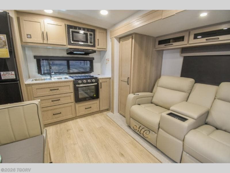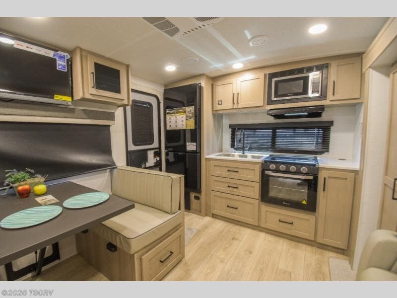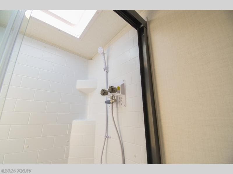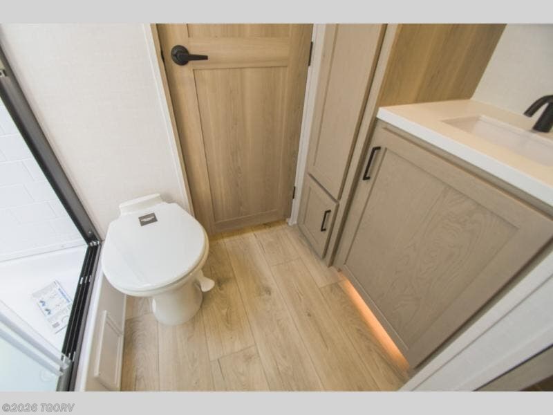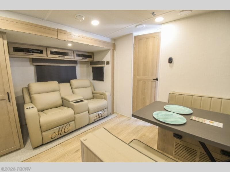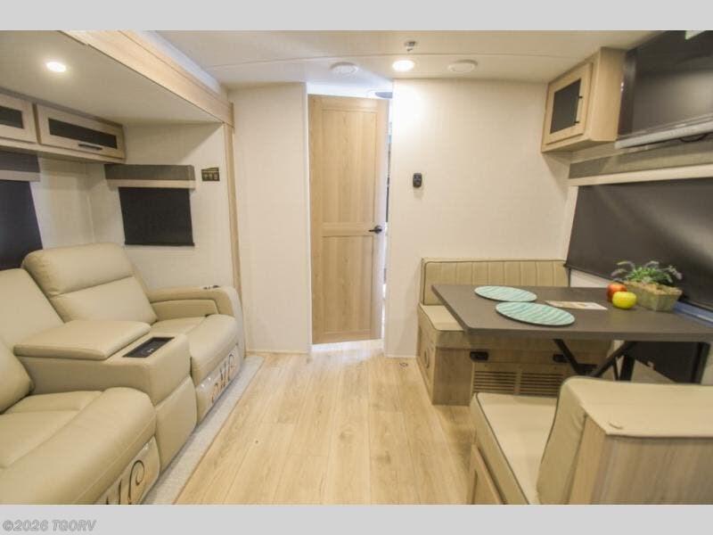 The main living area features comfortable 67" theater seating with cupholders, creating a perfect place to relax or dine together. The spacious walk-through full bathroom sits centrally in the coach, offering easy access from both the living area and bedroom while providing a spacious setup to get ready for the day.