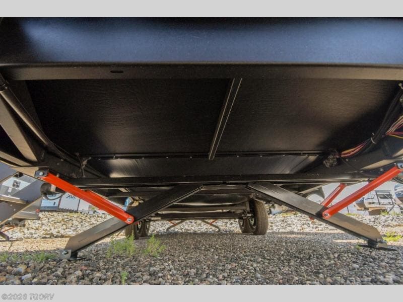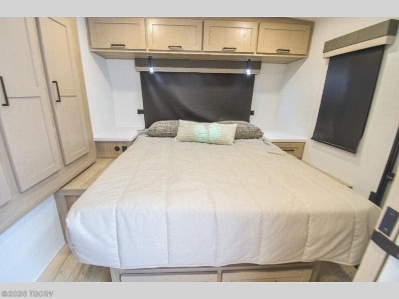 Up front, the front private bedroom includes an RV queen bed, wardrobe slide, and optional TV prep for added comfort. Storage is thoughtfully designed throughout, including a pantry for snacks and a drop-frame pass-through for larger gear. Outside, dual entry doors improve accessibility and make moving in and out of the trailer more convenient at the campsite.
