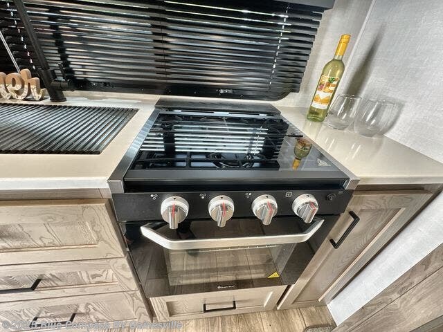 You and your spouse will have a great time camping in this travel trailer! You will have your own RV queen bed to sleep on in the front private bedroom, and an optional TV can be added if you enjoy the morning news in bed. Breakfast can be made on the three burner cooktop in the rear kitchen, or head outdoors to cook on the outside griddle. The 67" theater seating with cupholders will provide a place to relax and dine together, and the spacious walk-through bath will allow you to clean up before you head out for the day. This model includes plenty of storage space, including a pantry for your snacks, a wardrobe slide out in the bedroom, plus a drop-frame pass-through storage for larger camp gear!