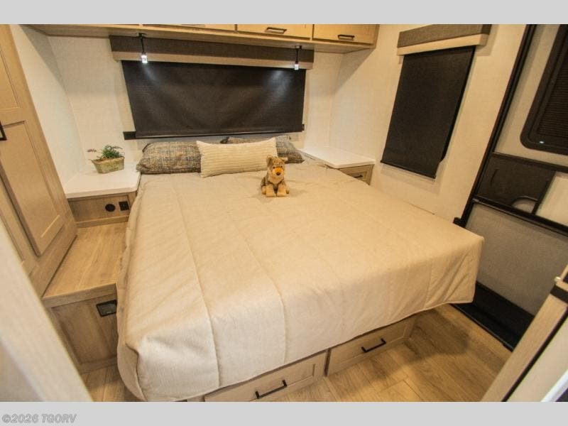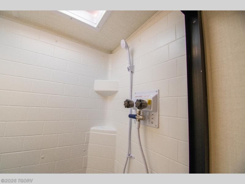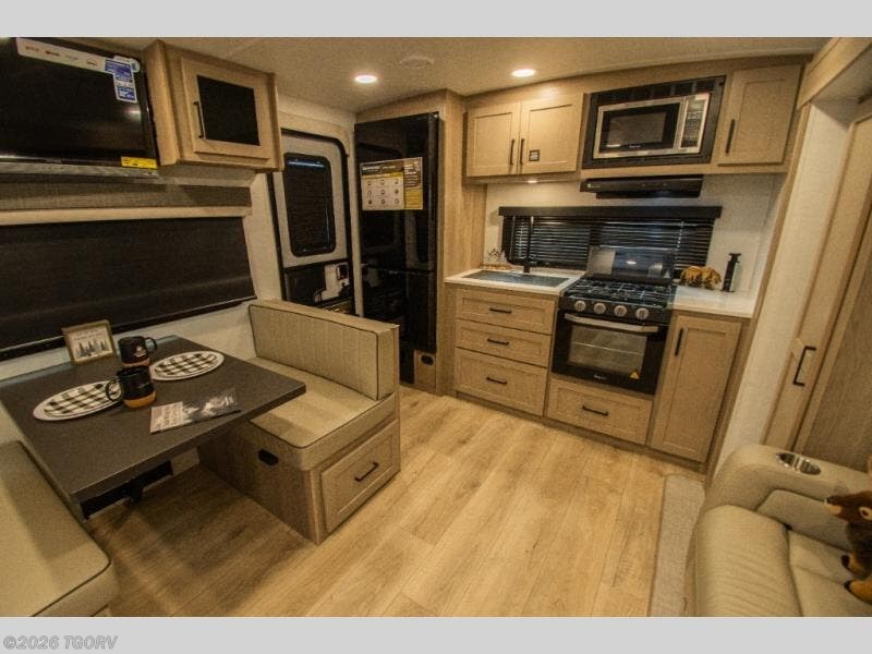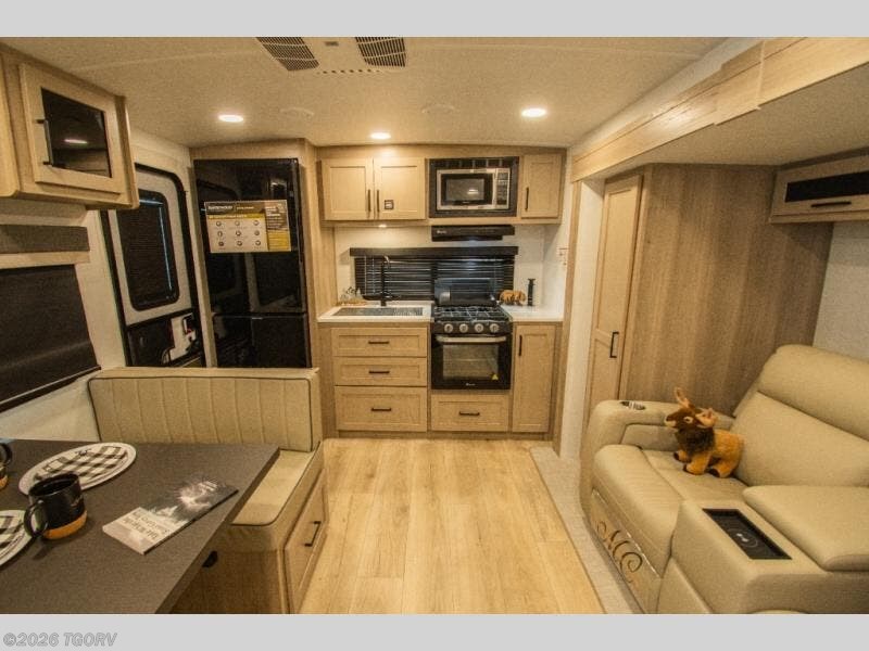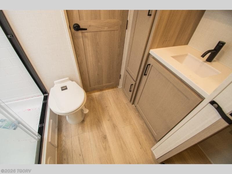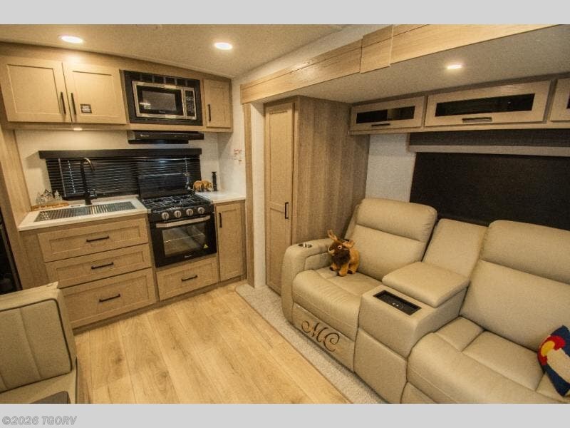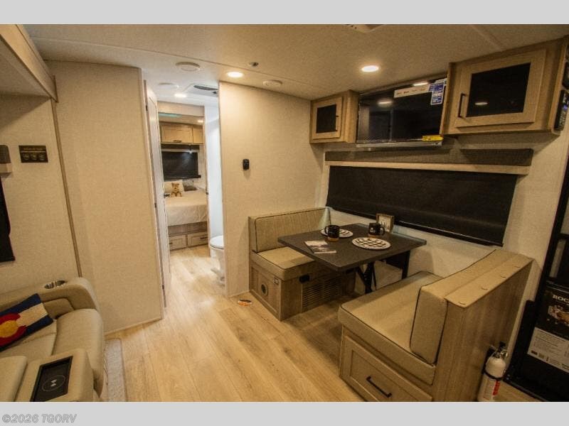 The main living area features comfortable 67" theater seating with cupholders, creating a perfect place to relax or dine together. The spacious walk-through full bathroom sits centrally in the coach, offering easy access from both the living area and bedroom while providing a spacious setup to get ready for the day.