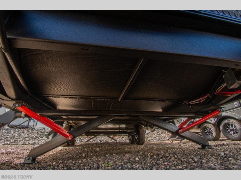 Up front, the front private bedroom includes an RV queen bed, wardrobe slide, and optional TV prep for added comfort. Storage is thoughtfully designed throughout, including a pantry for snacks and a drop-frame pass-through for larger gear. Outside, dual entry doors improve accessibility and make moving in and out of the trailer more convenient at the campsite.
