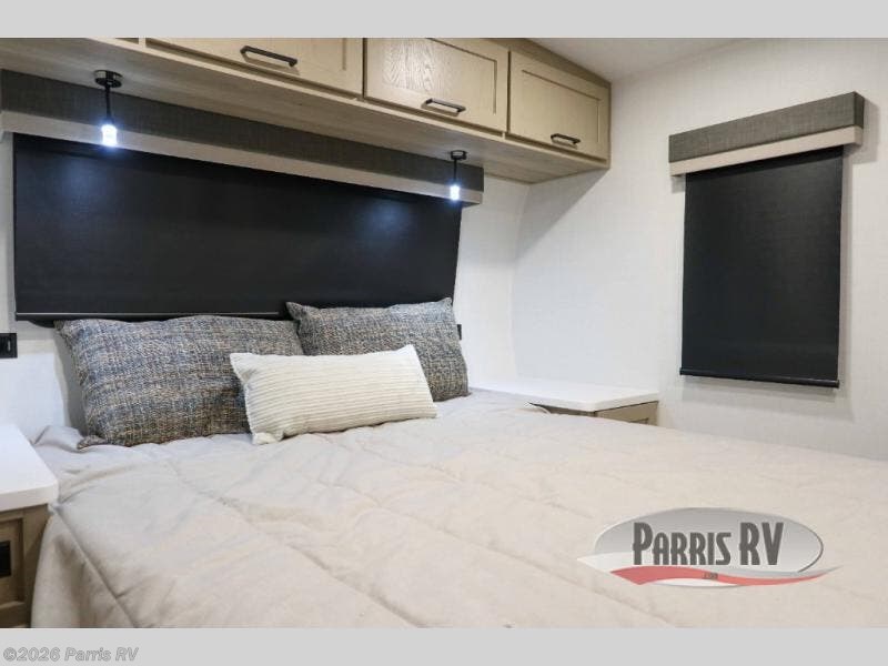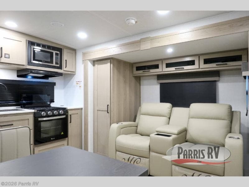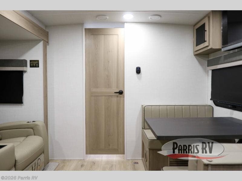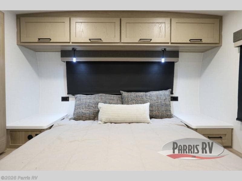 You and your spouse will have a great time camping in this travel trailer! You will have your own RV queen bed to sleep on in the front private bedroom, and an optional TV can be added if you enjoy the morning news in bed. Breakfast can be made on the three burner cooktop in the rear kitchen, or head outdoors to cook on the outside griddle. The 67" theater seating with cupholders will provide a place to relax and dine together, and the spacious walk-through bath will allow you to clean up before you head out for the day. This model includes plenty of storage space, including a pantry for your snacks, a wardrobe slide out in the bedroom, plus a drop-frame pass-through storage for larger camp gear!