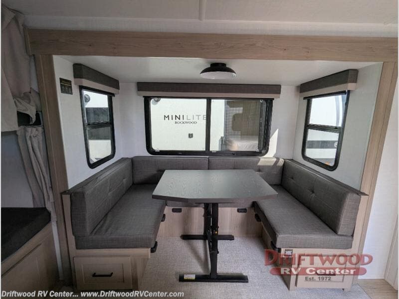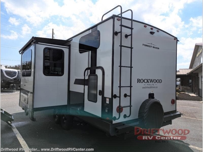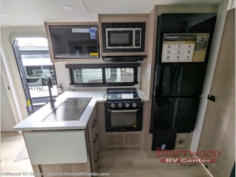 Each Rockwood Mini Lite travel trailer by Forest River is constructed with a fully laminated one-piece walkable roof, sleek frameless windows, and a six-sided full aluminum frame for strength and durability. The 12V thermostatically controlled heated tanks, plus radiant foil in the underbelly will allow you to camp well into the colder months, and the 200W roof solar panel will be perfect for a little off-gridding. Each model includes solid surface kitchen countertops, hidden hinge cabinet doors, roller shades, plus many more interior features. Having an AIR 360+ omnidirectional antenna with WiFi prep on board gives you the option to get some work done if it's needed, and the power tongue jack provides hassle-free set up, so you can enjoy more time relaxing!