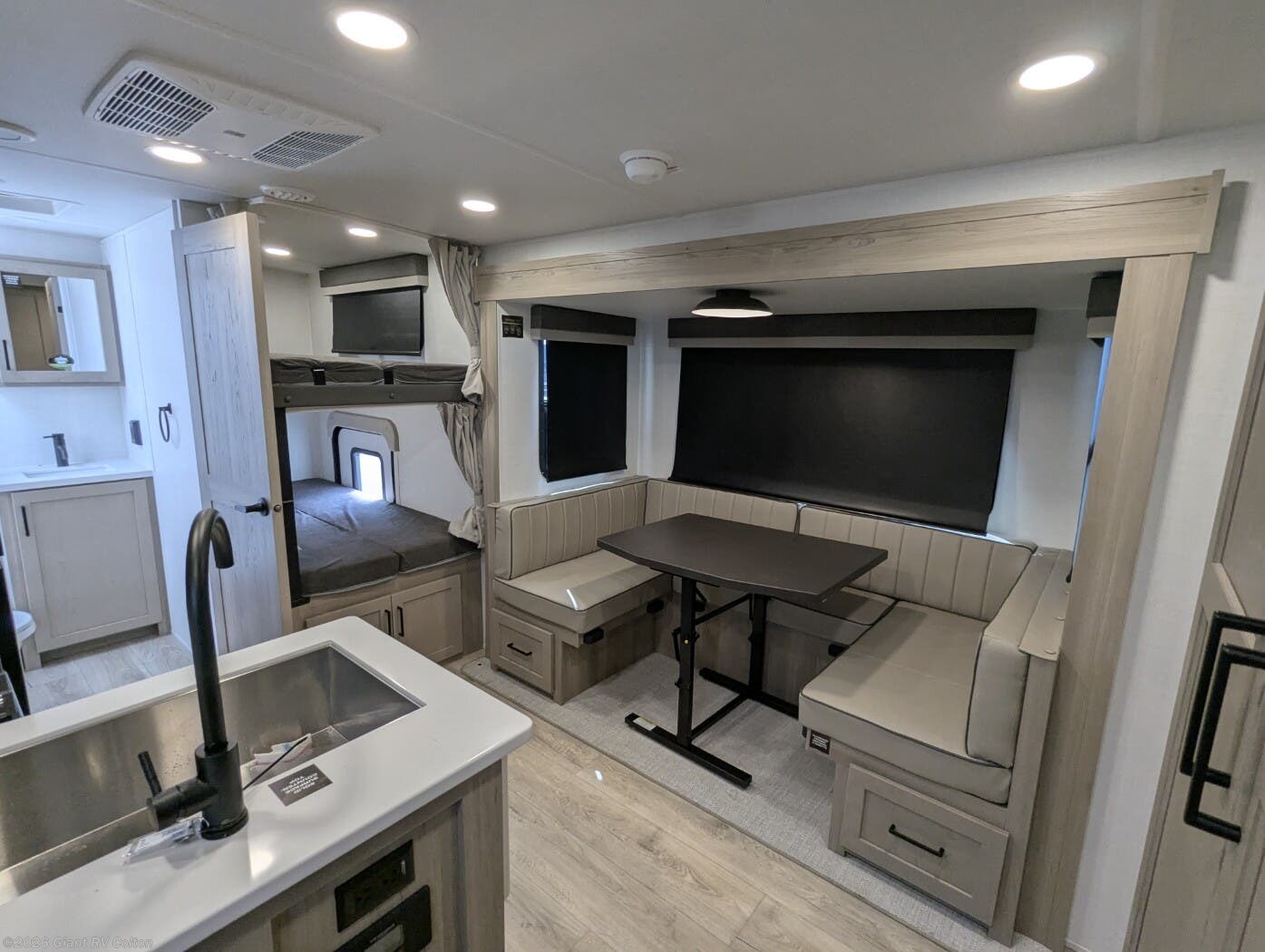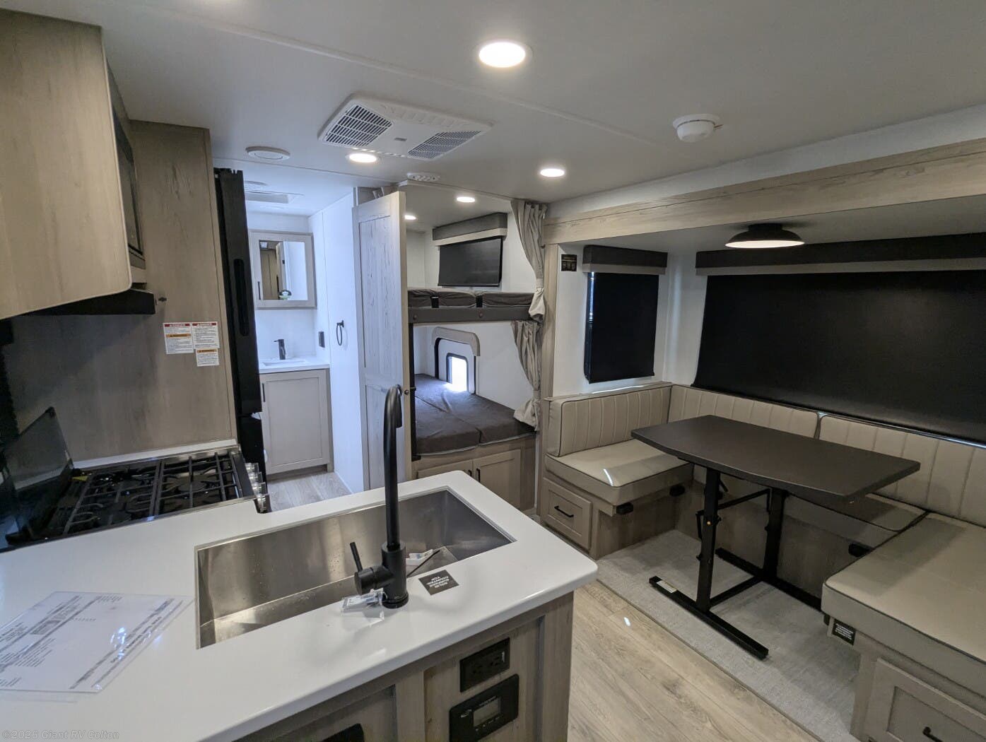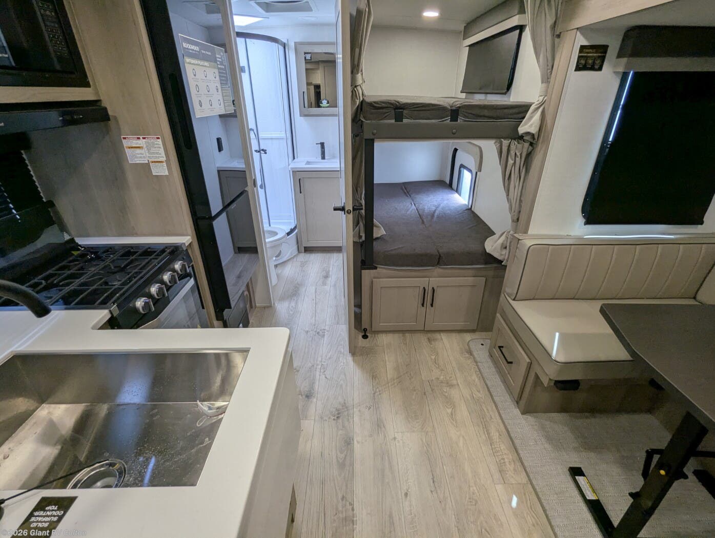 • Family Bunkhouse Floorplan with rear bunks, a front bedroom, and convertible U-shaped dinette — maximizing sleeping and living space in under 26 feet.