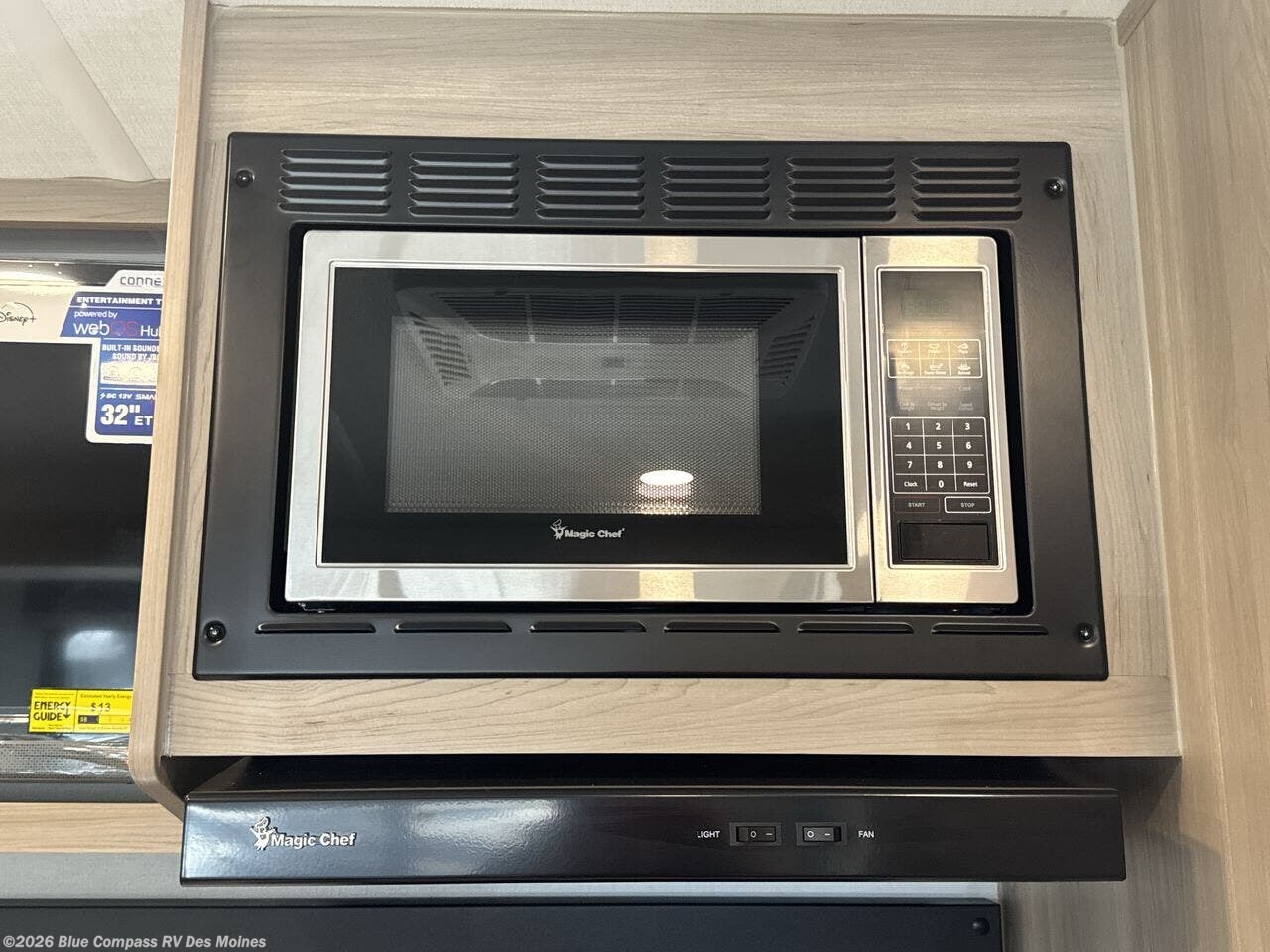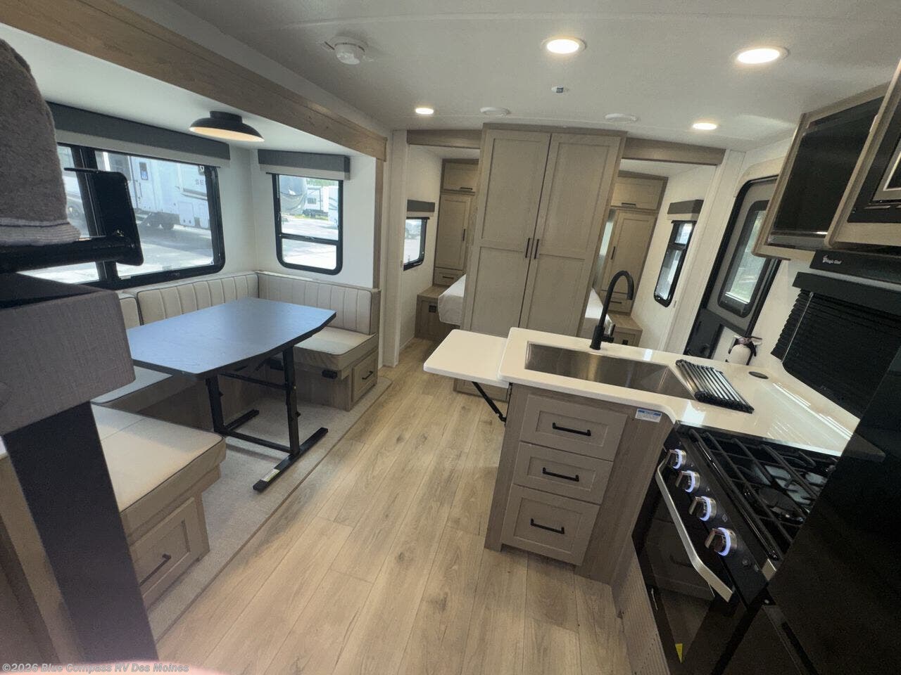 This bunkhouse model is perfect for your crew of six! You will appreciate the exterior bike door that lets you store gear under the flip-up bottom bunk, plus there is a pass-thru storage up front for even more storage. The RV queen bed in the front bedroom includes flip-up storage, two wardrobes, and a TV option if you like to stay up late with a movie. In the morning, everyone can meet in the combined kitchen and living area to dine around the U-shaped dinette, or you can take your plate outdoors to sit under the 18' power awning with LED lights.