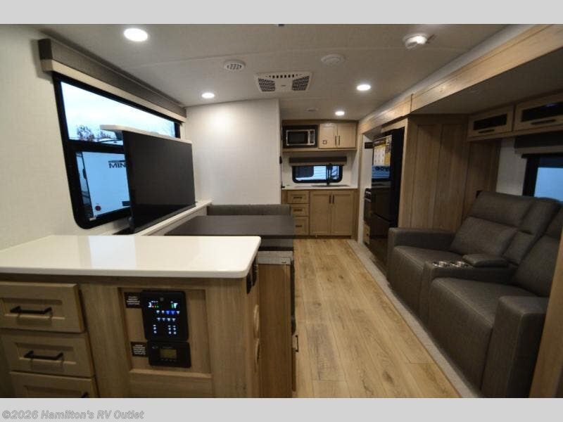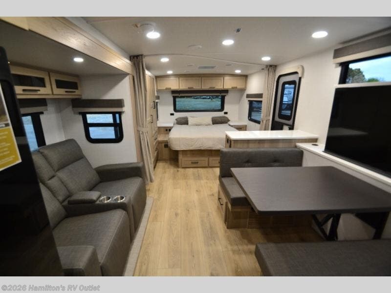 This stunning travel trailer is designed to provide the ultimate in comfort, convenience on the open road. The full bathroom is a haven for relaxation and refreshment, while the kitchen is equipped with a microwave, overhead cabinets, a three-burner cooktop, and a 12V refrigerator, making meal prep and dining the easiest task. The kitchen pantry provides ample storage for your favorite ingredients. Further, the booth dinette is a cozy spot for meals or socializing, and the theater seating is perfect for relaxing and enjoying your favorite shows or movies on the 12V Smart TV. Plus, the front bedroom is a serene retreat, featuring a spacious queen bed and convenient wardrobe, providing the perfect spot to rest and recharge after a day of adventure.