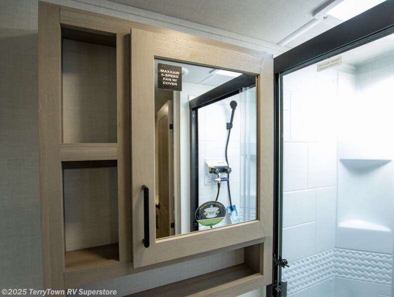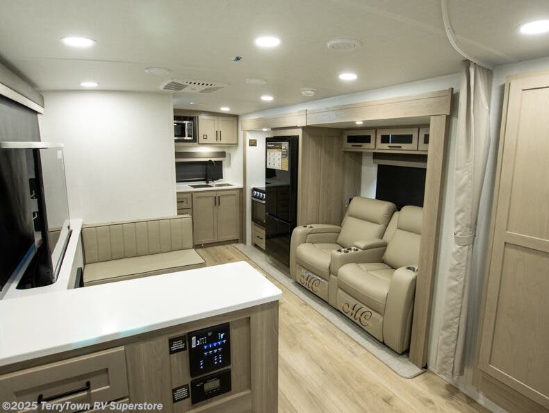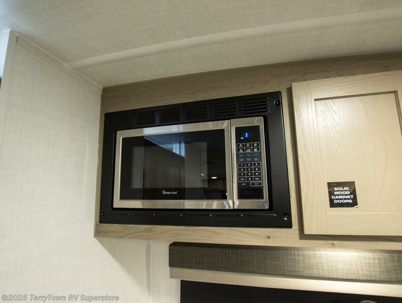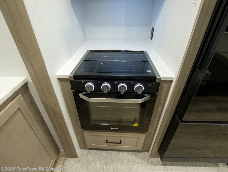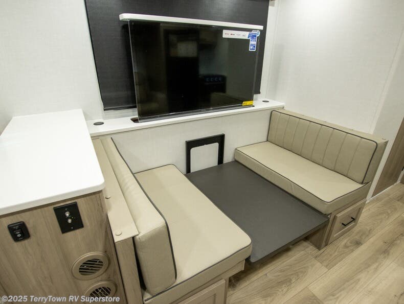 This stunning travel trailer is designed to provide the ultimate in comfort, convenience on the open road. The full bathroom is a haven for relaxation and refreshment, while the kitchen is equipped with a microwave, overhead cabinets, a three-burner cooktop, and a 12V refrigerator, making meal prep and dining the easiest task. The kitchen pantry provides ample storage for your favorite ingredients. Further, the booth dinette is a cozy spot for meals or socializing, and the theater seating is perfect for relaxing and enjoying your favorite shows or movies on the 12V Smart TV. Plus, the front bedroom is a serene retreat, featuring a spacious queen bed and convenient wardrobe, providing the perfect spot to rest and recharge after a day of adventure.