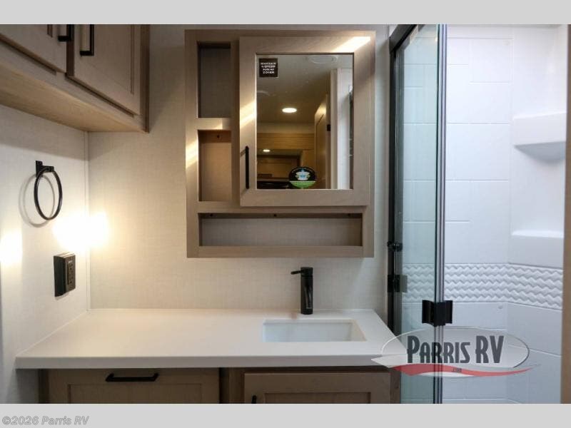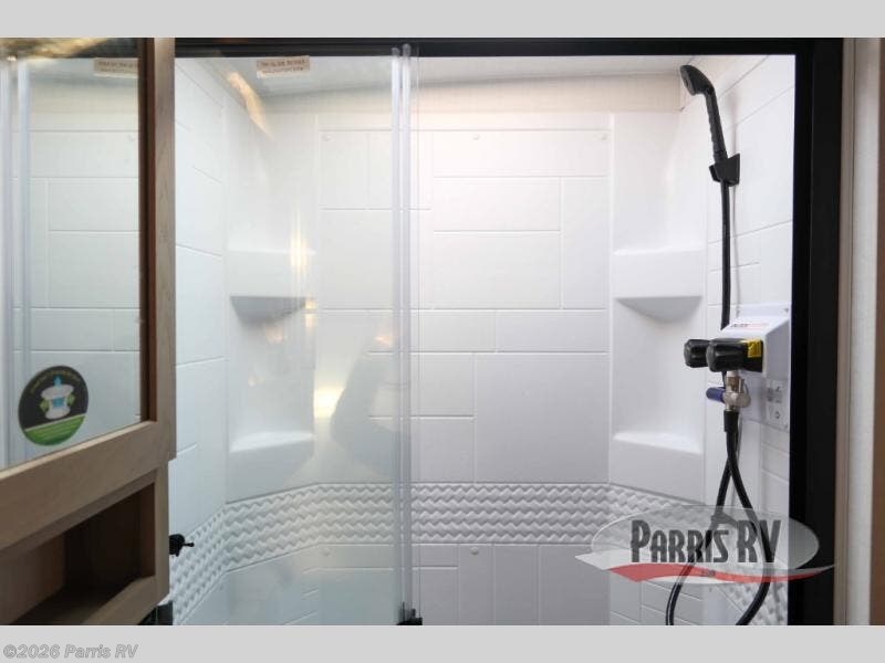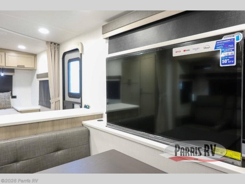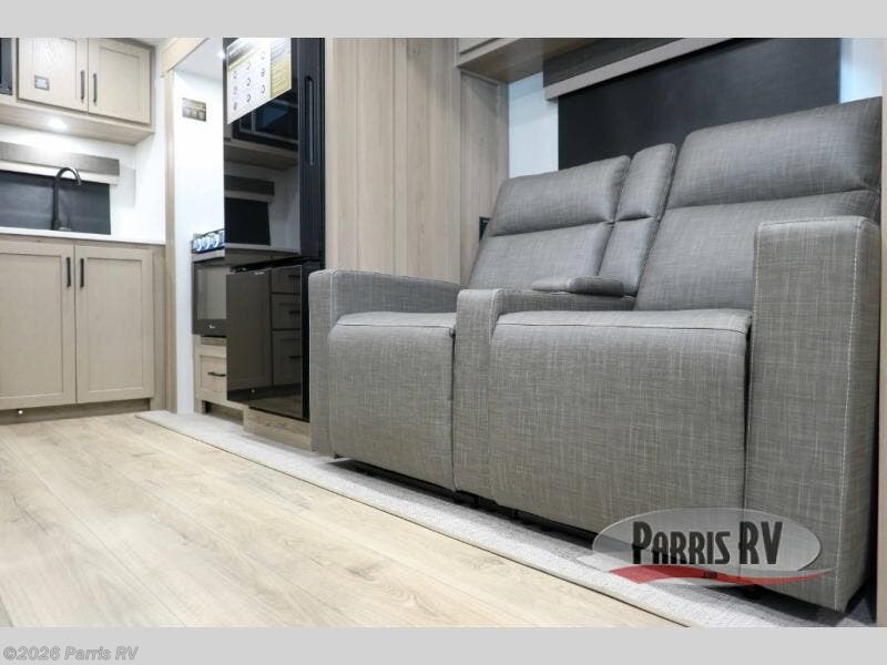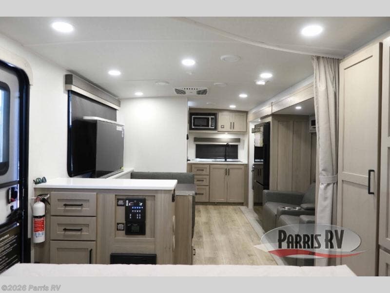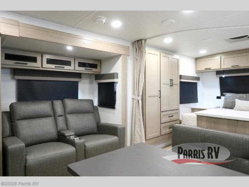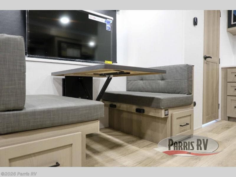 This stunning travel trailer is designed to provide the ultimate in comfort, convenience on the open road. The full bathroom is a haven for relaxation and refreshment, while the kitchen is equipped with a microwave, overhead cabinets, a three-burner cooktop, and a 12V refrigerator, making meal prep and dining the easiest task. The kitchen pantry provides ample storage for your favorite ingredients. Further, the booth dinette is a cozy spot for meals or socializing, and the theater seating is perfect for relaxing and enjoying your favorite shows or movies on the 12V Smart TV. Plus, the front bedroom is a serene retreat, featuring a spacious queen bed and convenient wardrobe, providing the perfect spot to rest and recharge after a day of adventure.
