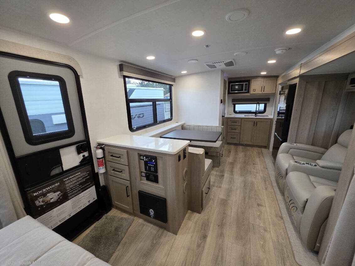 The brand new 2 slide, Front master bed, rear kitchen, theater seating, telavator, and all the standard features that Set Rockwood apart, including dual solar panels, 1800W inveter so you can rum almost anything including 110 outlets off your 12V house battery's . & MOST IMPORTANT the Rockwood quality that is second to none!
