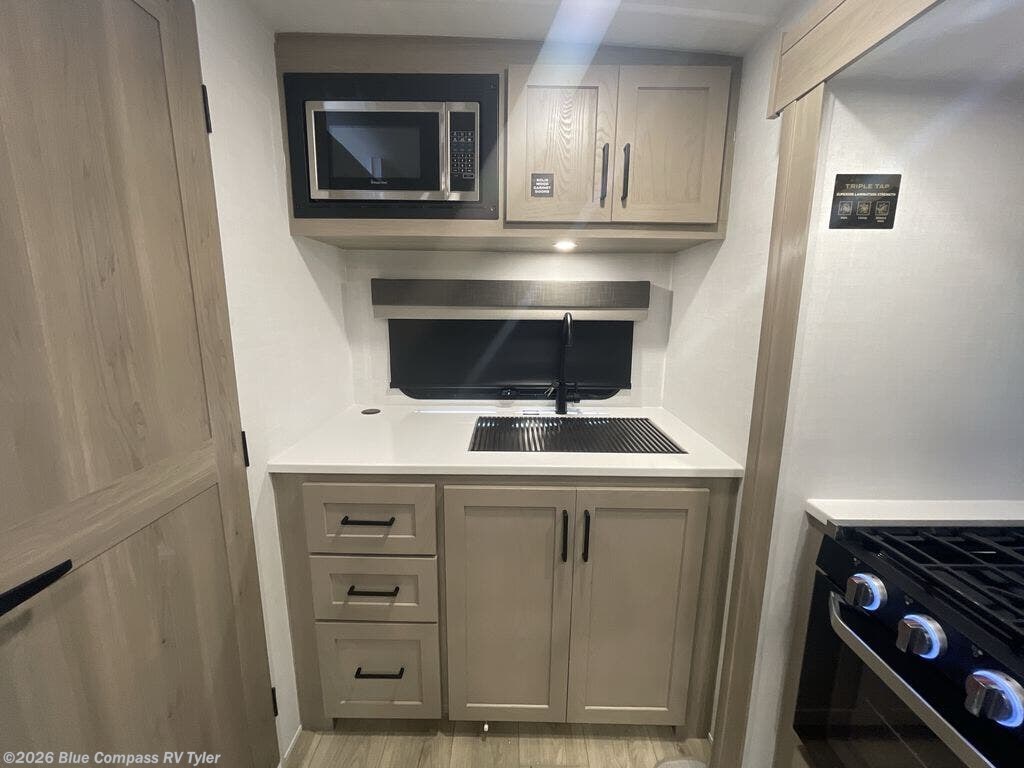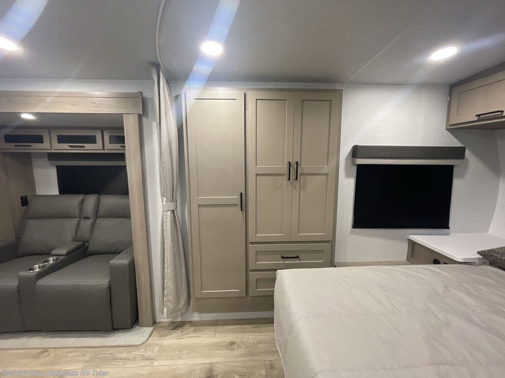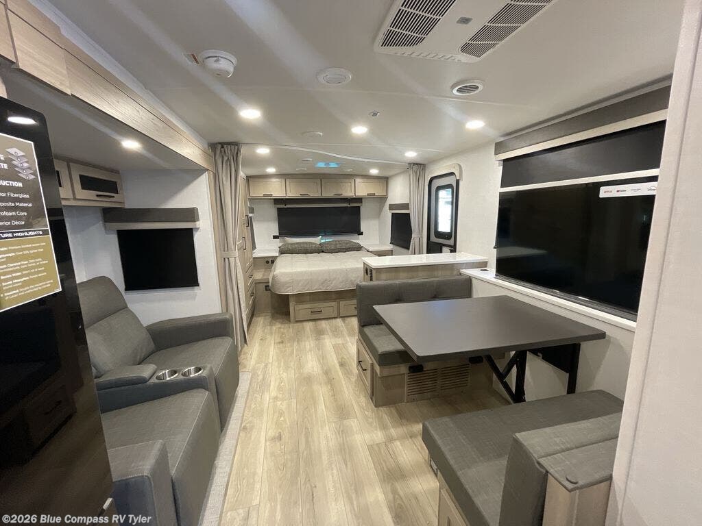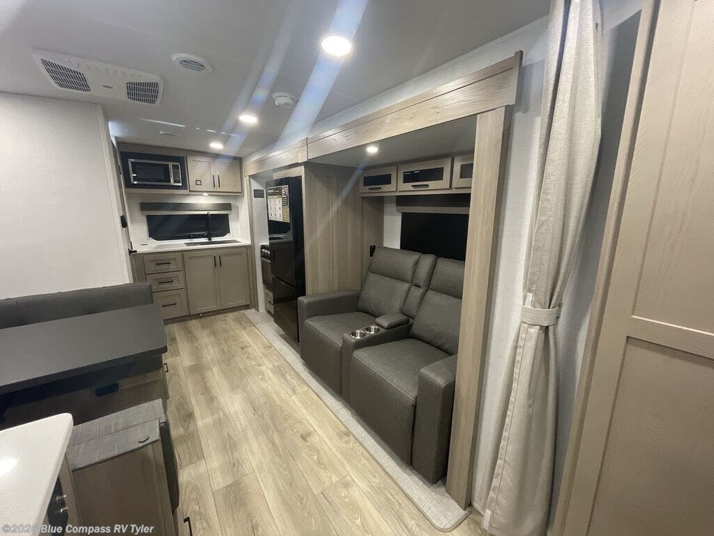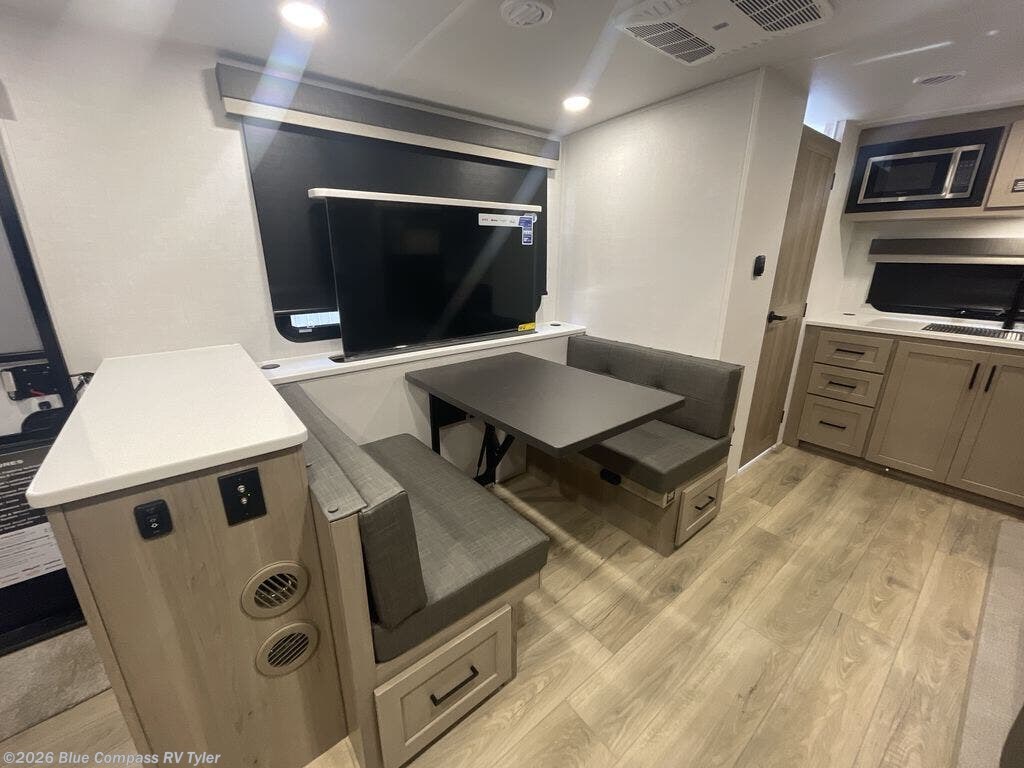This stunning travel trailer is designed to provide the ultimate in comfort, convenience on the open road. The full bathroom is a haven for relaxation and refreshment, while the kitchen is equipped with a microwave, overhead cabinets, a three-burner cooktop, and a 12V refrigerator, making meal prep and dining the easiest task. The kitchen pantry provides ample storage for your favorite ingredients. Further, the booth dinette is a cozy spot for meals or socializing, and the theater seating is perfect for relaxing and enjoying your favorite shows or movies on the 12V Smart TV. Plus, the front bedroom is a serene retreat, featuring a spacious queen bed and convenient wardrobe, providing the perfect spot to rest and recharge after a day of adventure.