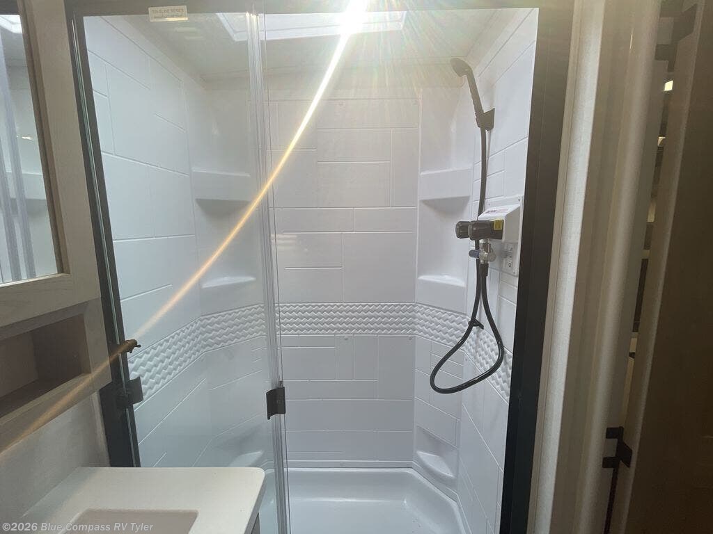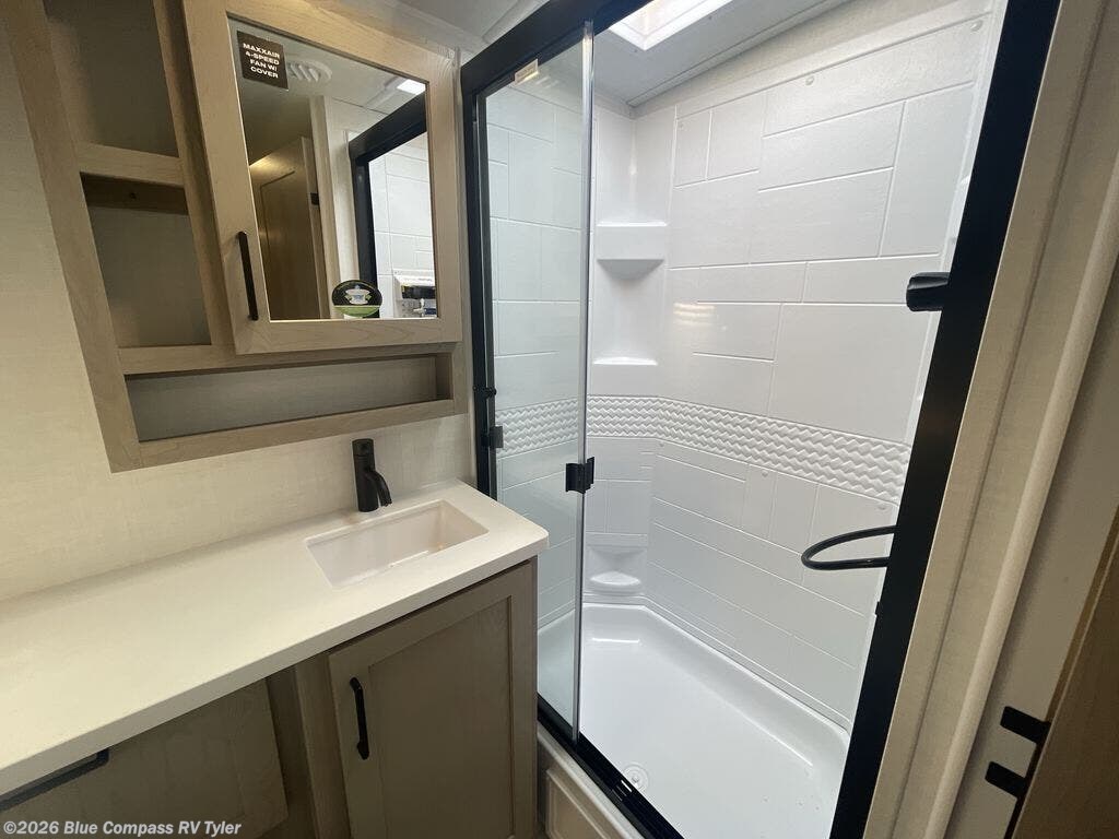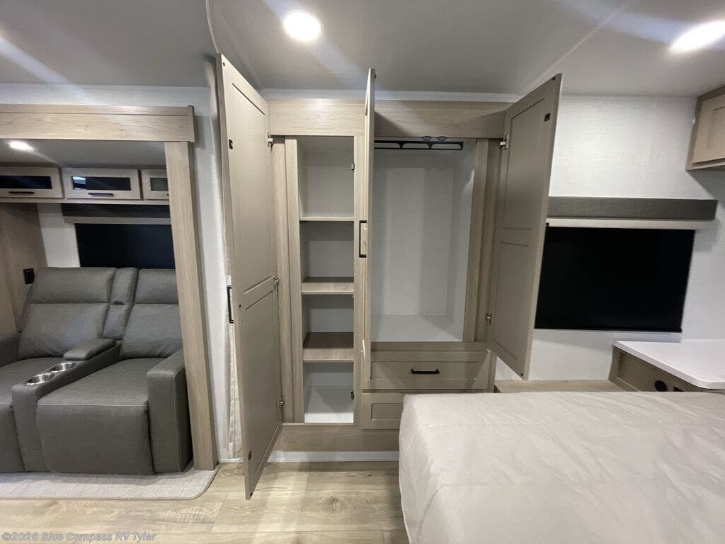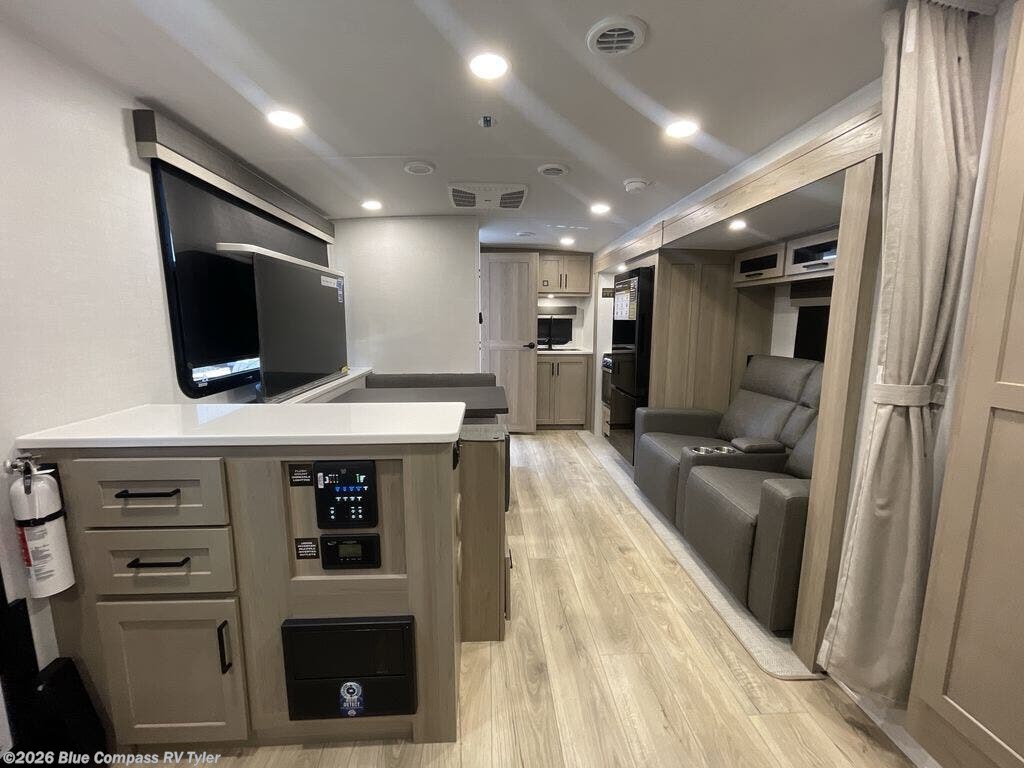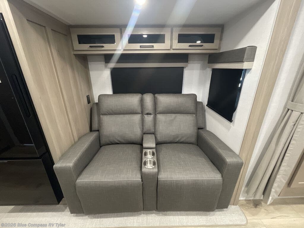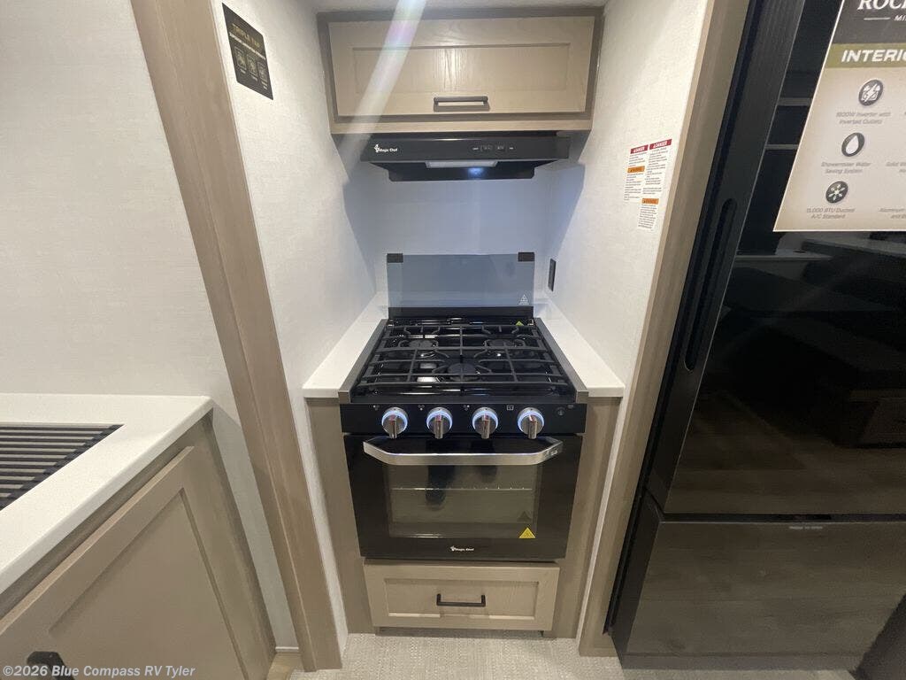 This stunning travel trailer is designed to provide the ultimate in comfort, convenience on the open road. The full bathroom is a haven for relaxation and refreshment, while the kitchen is equipped with a microwave, overhead cabinets, a three-burner cooktop, and a 12V refrigerator, making meal prep and dining the easiest task. The kitchen pantry provides ample storage for your favorite ingredients. Further, the booth dinette is a cozy spot for meals or socializing, and the theater seating is perfect for relaxing and enjoying your favorite shows or movies on the 12V Smart TV. Plus, the front bedroom is a serene retreat, featuring a spacious queen bed and convenient wardrobe, providing the perfect spot to rest and recharge after a day of adventure.
