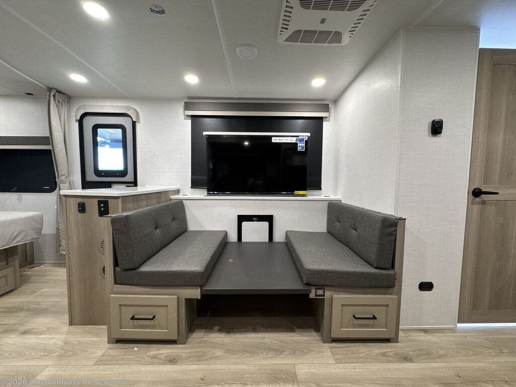 This stunning travel trailer is designed to provide the ultimate in comfort, convenience on the open road. The full bathroom is a haven for relaxation and refreshment, while the kitchen is equipped with a microwave, overhead cabinets, a three-burner cooktop, and a 12V refrigerator, making meal prep and dining the easiest task. The kitchen pantry provides ample storage for your favorite ingredients. Further, the booth dinette is a cozy spot for meals or socializing, and the theater seating is perfect for relaxing and enjoying your favorite shows or movies on the 12V Smart TV. Plus, the front bedroom is a serene retreat, featuring a spacious queen bed and convenient wardrobe, providing the perfect spot to rest and recharge after a day of adventure.