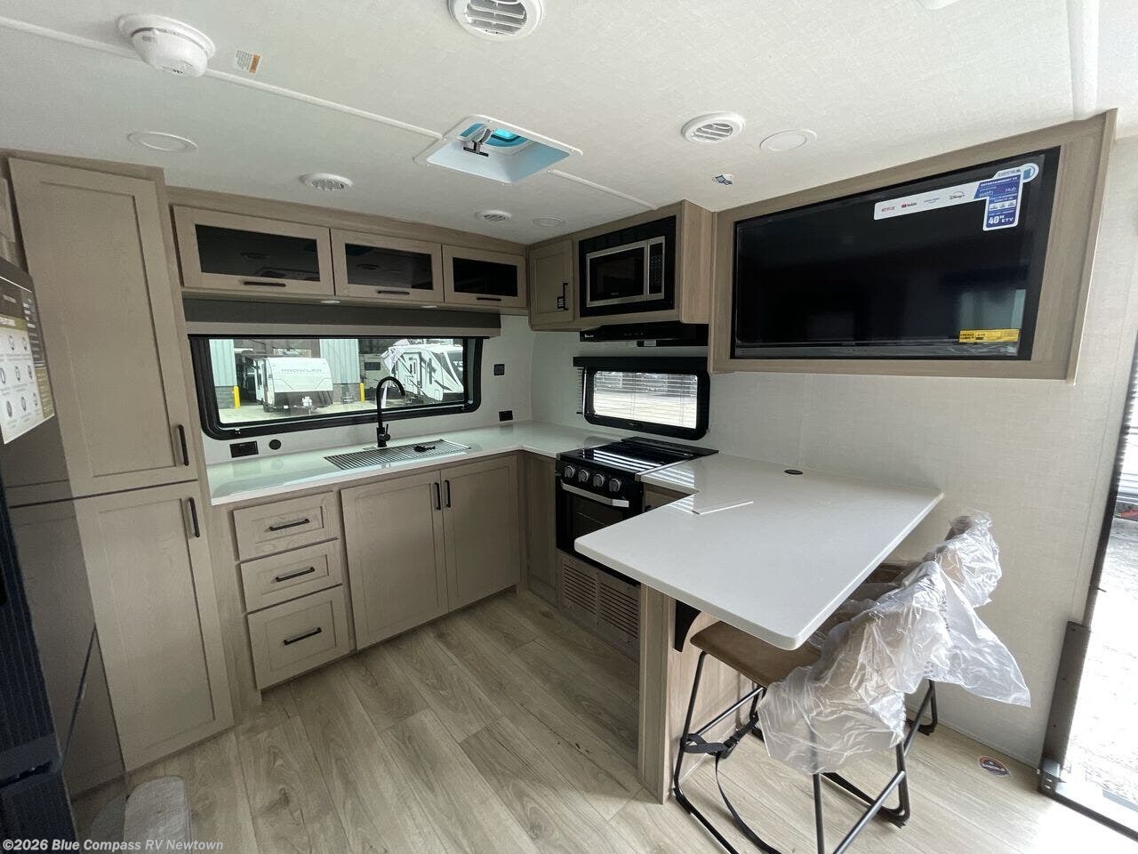 This travel trailer is the best option for you and your partner! The lavish full rear bathroom features a spacious layout and a convenient linen closet, perfect for relaxation and refreshment. The elegant bedroom boasts a plush queen bed, ample wardrobe space, and stylish dresser, creating a serene retreat. The spacious living room and kitchen combined area is the heart of the trailer, featuring plush theater seating for cozy movie nights, a generous closet for storing essentials, and a 12V Smart TV for entertainment on the go. Plus, the expansive countertop with chairs provides a perfect spot for gourmet meals or socializing, while the premium three-burner cooktop, kitchen pantry, and microwave make meal prep and cooking a true delight.