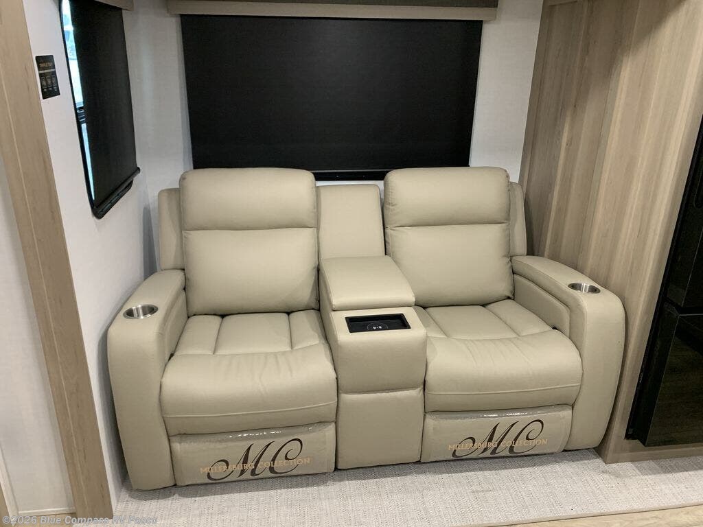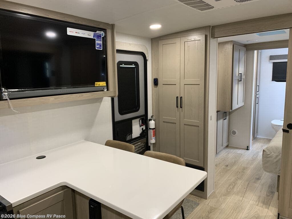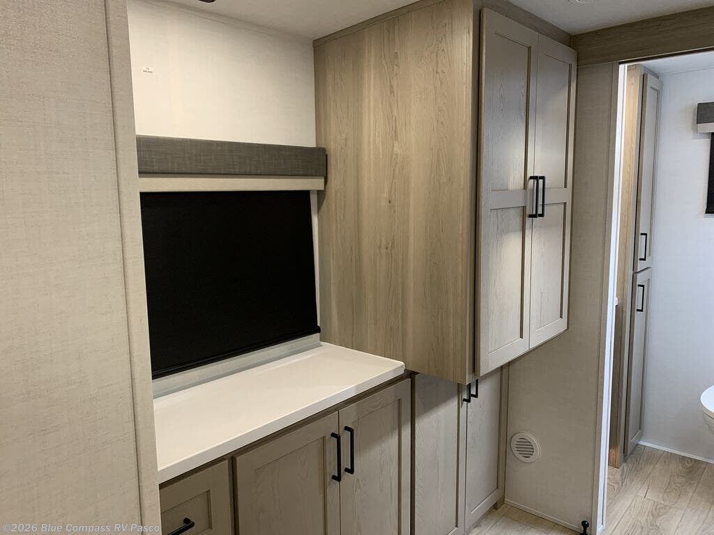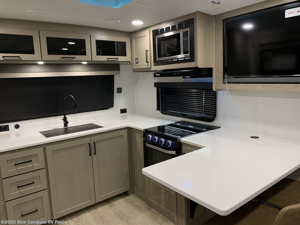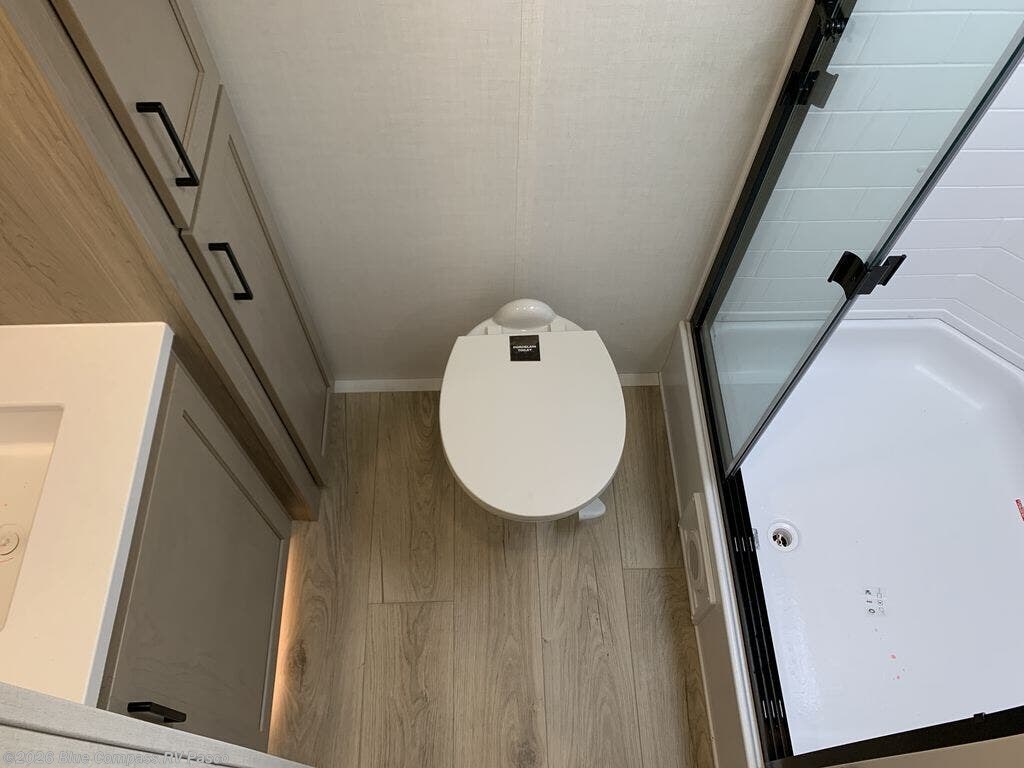 This travel trailer is the best option for you and your partner! The lavish full rear bathroom features a spacious layout and a convenient linen closet, perfect for relaxation and refreshment. The elegant bedroom boasts a plush queen bed, ample wardrobe space, and stylish dresser, creating a serene retreat. The spacious living room and kitchen combined area is the heart of the trailer, featuring plush theater seating for cozy movie nights, a generous closet for storing essentials, and a 12V Smart TV for entertainment on the go. Plus, the expansive countertop with chairs provides a perfect spot for gourmet meals or socializing, while the premium three-burner cooktop, kitchen pantry, and microwave make meal prep and cooking a true delight.