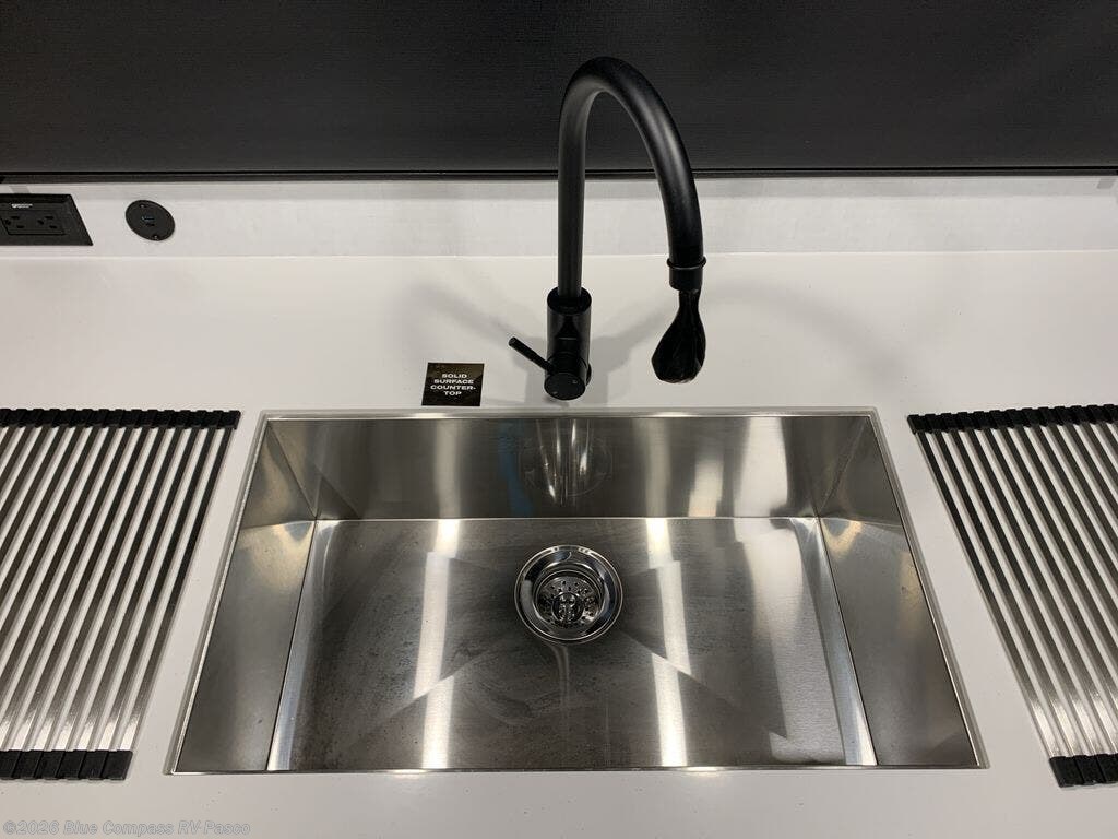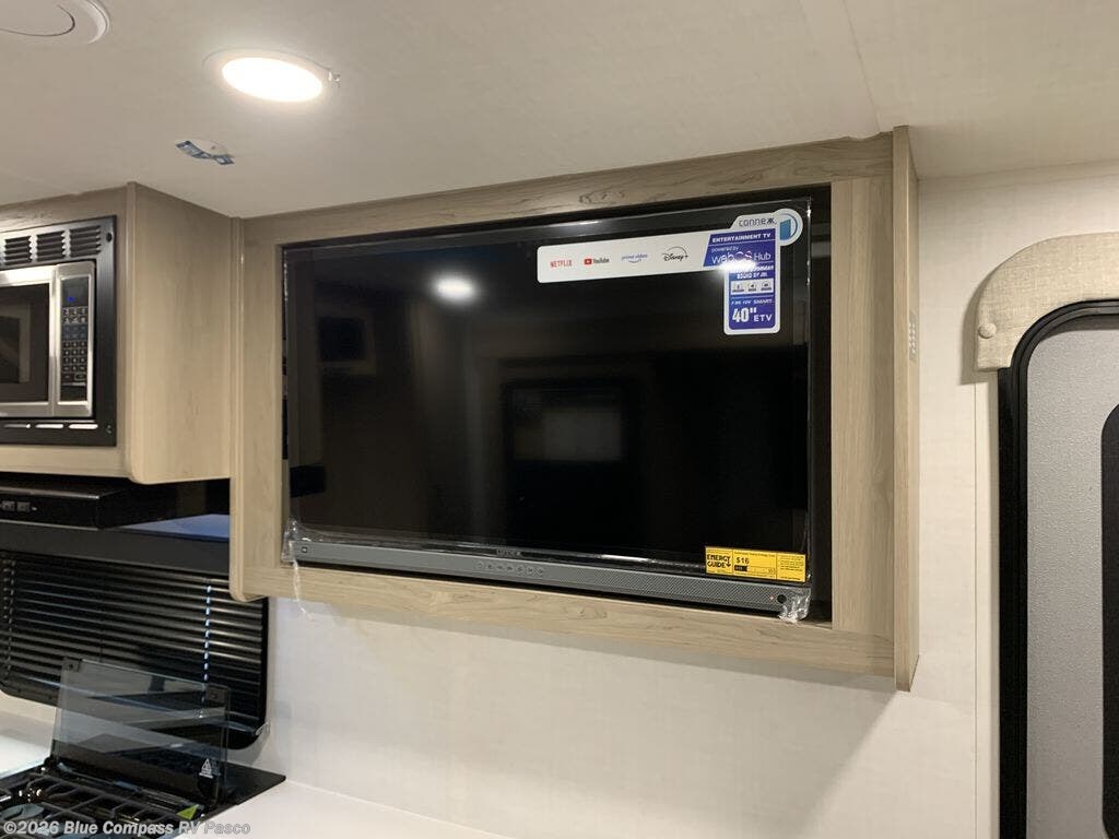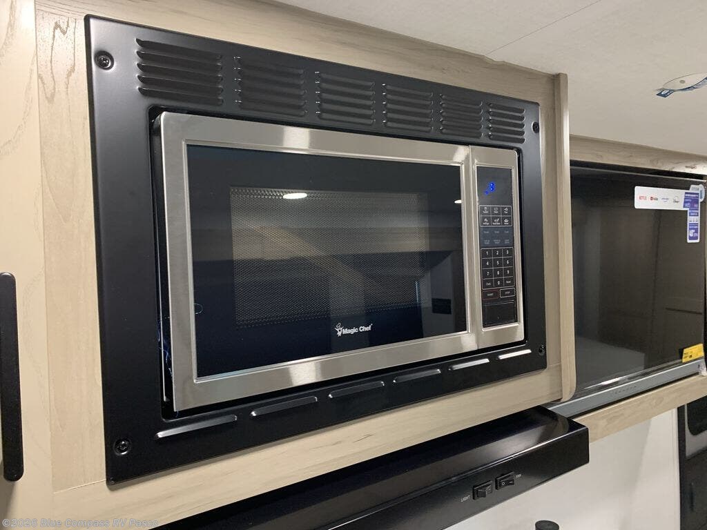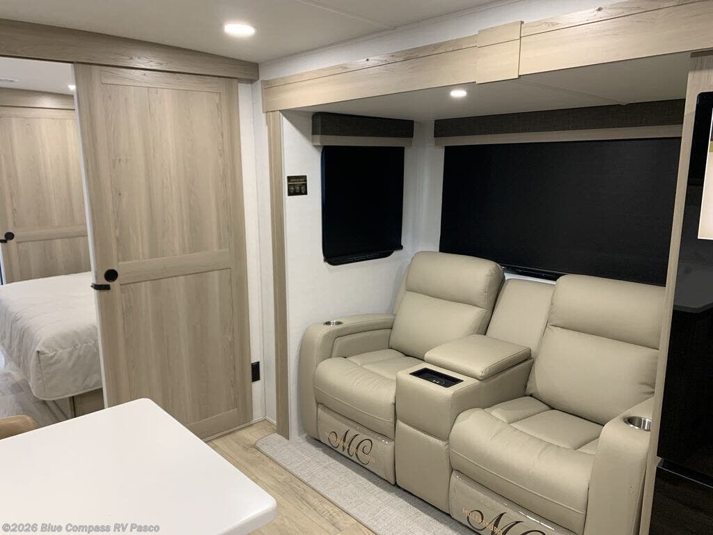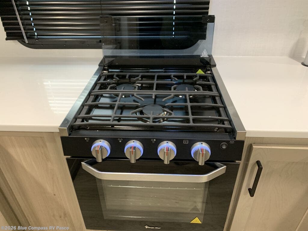 This travel trailer is the best option for you and your partner! The lavish full rear bathroom features a spacious layout and a convenient linen closet, perfect for relaxation and refreshment. The elegant bedroom boasts a plush queen bed, ample wardrobe space, and stylish dresser, creating a serene retreat. The spacious living room and kitchen combined area is the heart of the trailer, featuring plush theater seating for cozy movie nights, a generous closet for storing essentials, and a 12V Smart TV for entertainment on the go. Plus, the expansive countertop with chairs provides a perfect spot for gourmet meals or socializing, while the premium three-burner cooktop, kitchen pantry, and microwave make meal prep and cooking a true delight.