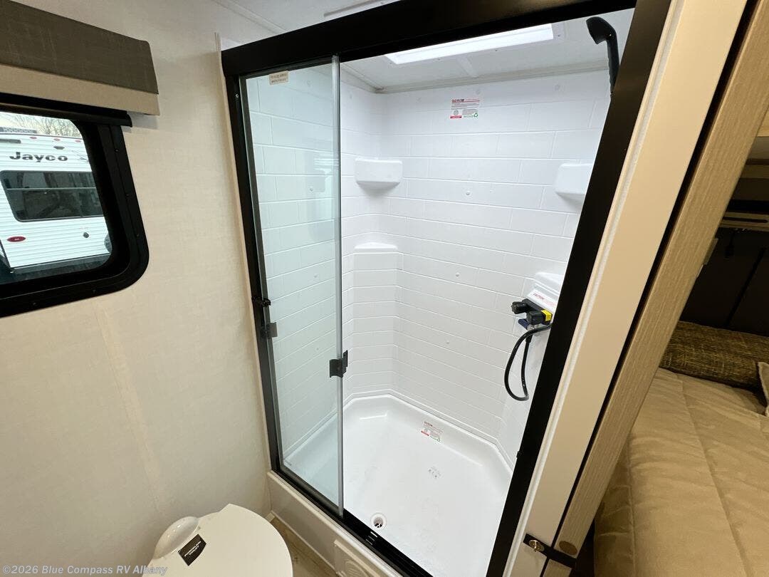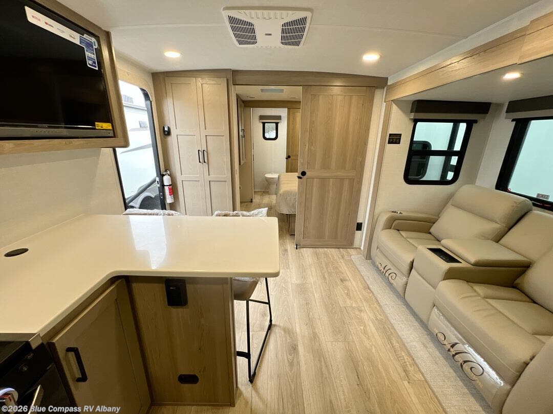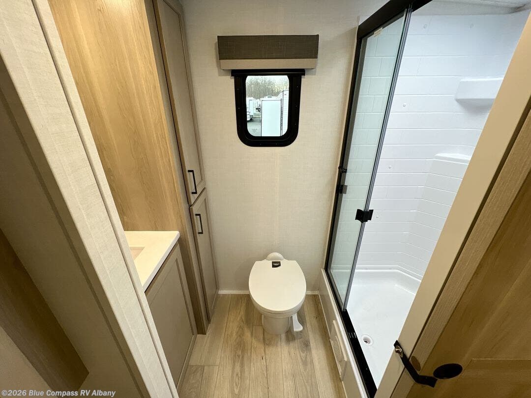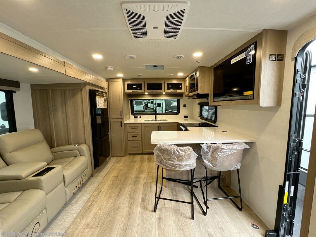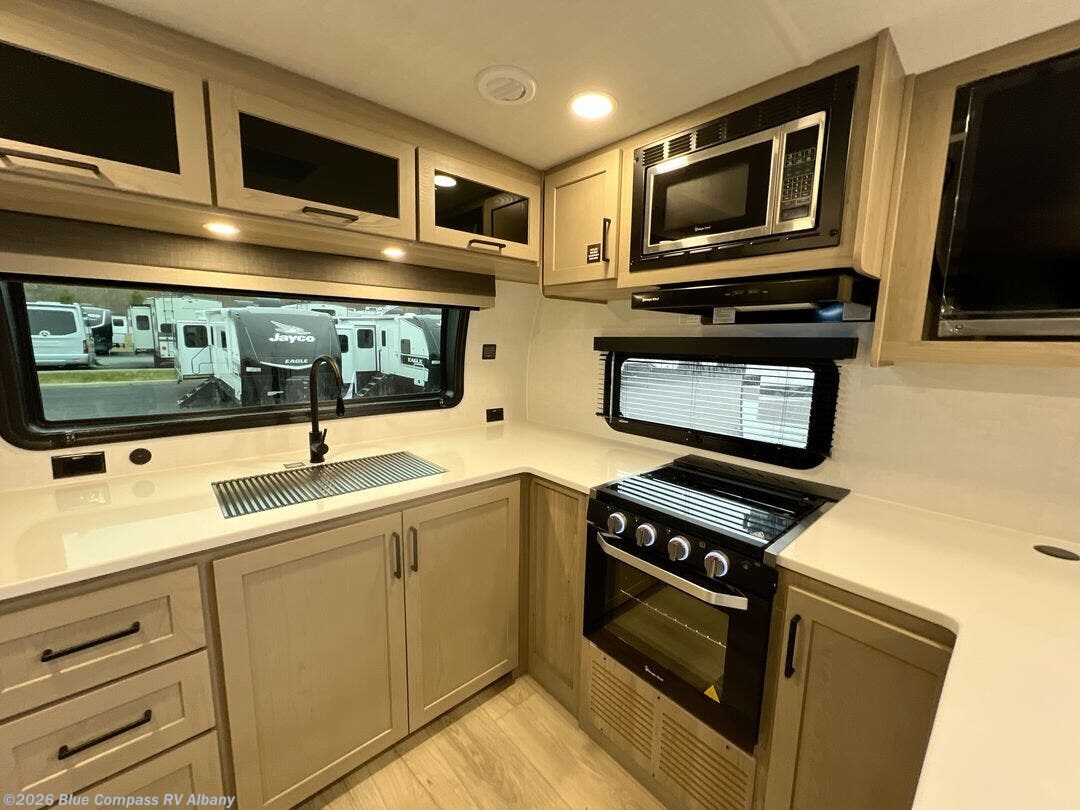 This travel trailer is the best option for you and your partner! The lavish full rear bathroom features a spacious layout and a convenient linen closet, perfect for relaxation and refreshment. The elegant bedroom boasts a plush queen bed, ample wardrobe space, and stylish dresser, creating a serene retreat. The spacious living room and kitchen combined area is the heart of the trailer, featuring plush theater seating for cozy movie nights, a generous closet for storing essentials, and a 12V Smart TV for entertainment on the go. Plus, the expansive countertop with chairs provides a perfect spot for gourmet meals or socializing, while the premium three-burner cooktop, kitchen pantry, and microwave make meal prep and cooking a true delight.