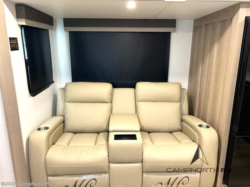 In the main living area, the theater seating offers a relaxing place to unwind, perfectly positioned for enjoying the 12V Smart TV. The open layout creates a welcoming environment for relaxing or entertaining.
