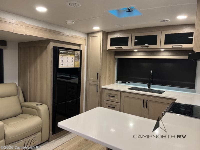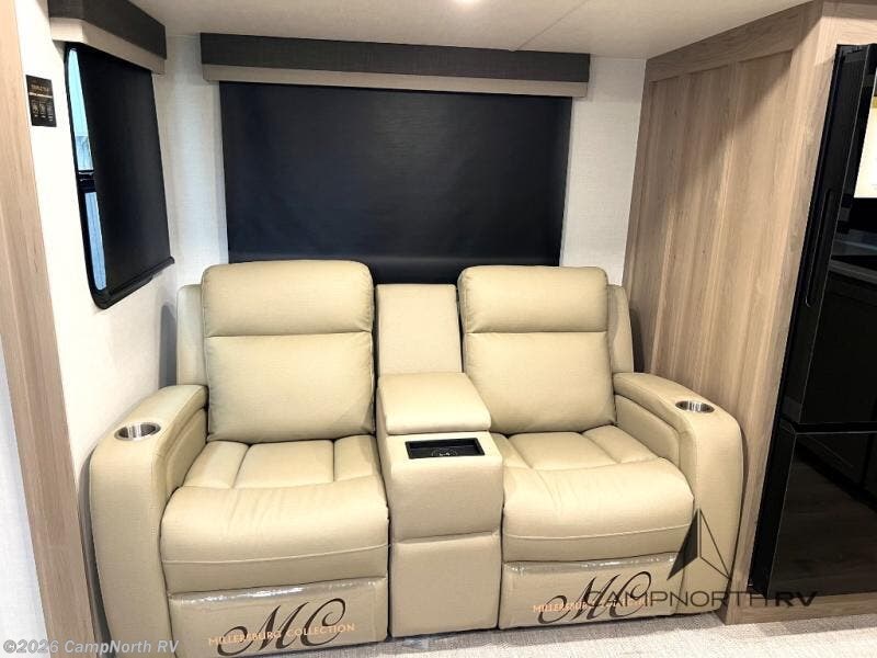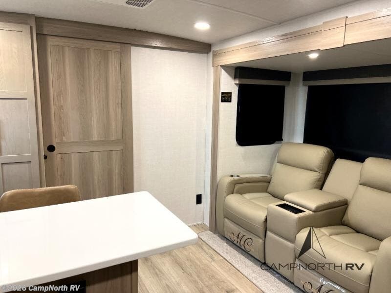 In the main living area, the theater seating offers a relaxing place to unwind, perfectly positioned for enjoying the 12V Smart TV. The open layout creates a welcoming environment for relaxing or entertaining.