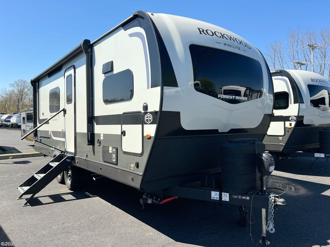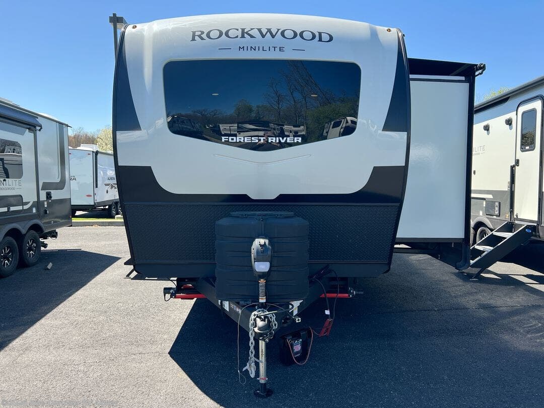 Each Rockwood Mini Lite travel trailer by Forest River is constructed with a fully laminated one-piece walkable roof, sleek frameless windows, and a six-sided full aluminum frame for strength and durability. The 12V thermostatically controlled heated tanks, plus radiant foil in the underbelly will allow you to camp well into the colder months, and the 200W roof solar panel will be perfect for a little off-gridding. Each model includes solid surface kitchen countertops, hidden hinge cabinet doors, roller shades, plus many more interior features. Having an AIR 360+ omnidirectional antenna with WiFi prep on board gives you the option to get some work done if it's needed, and the power tongue jack provides hassle-free set up, so you can enjoy more time relaxing!